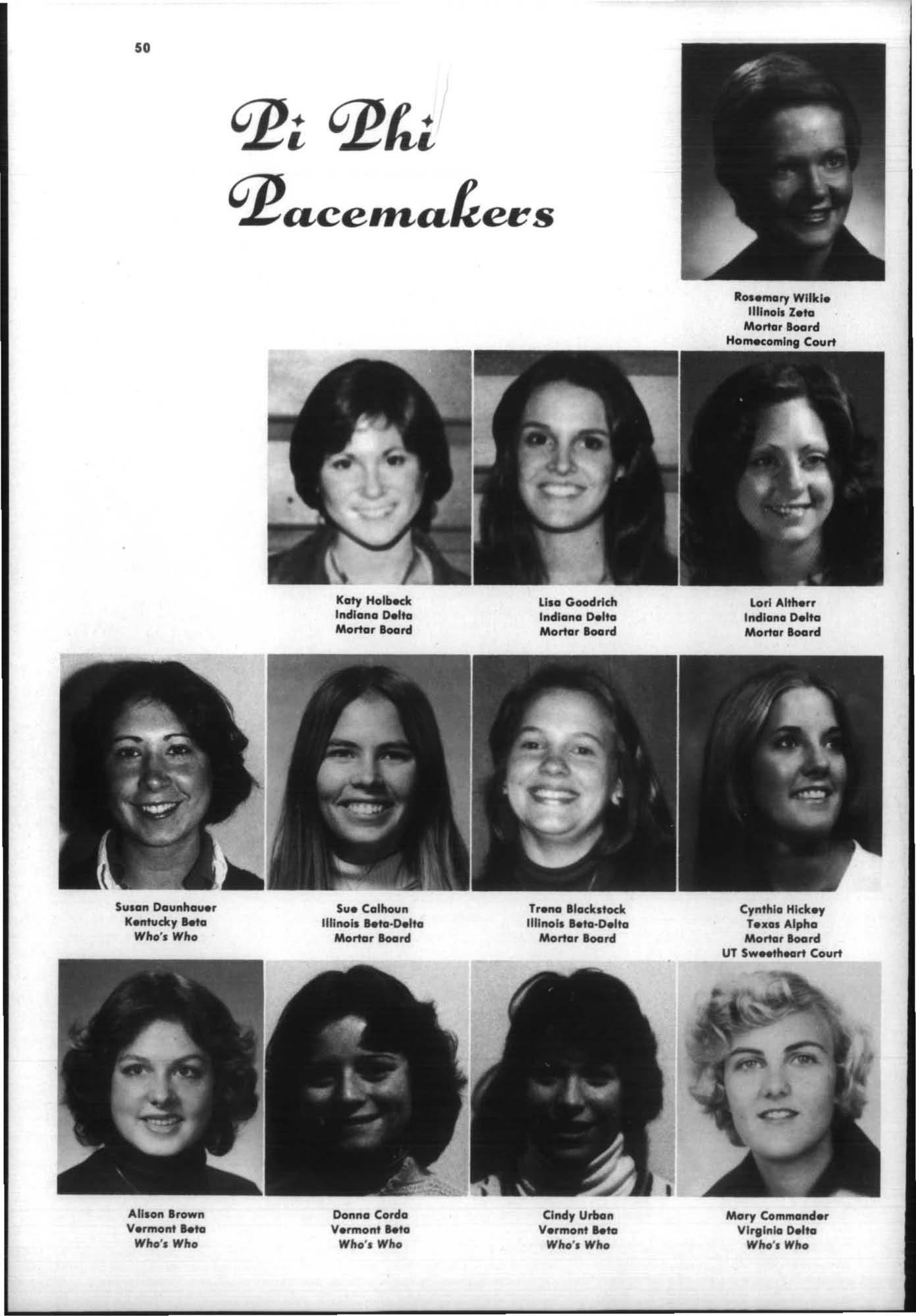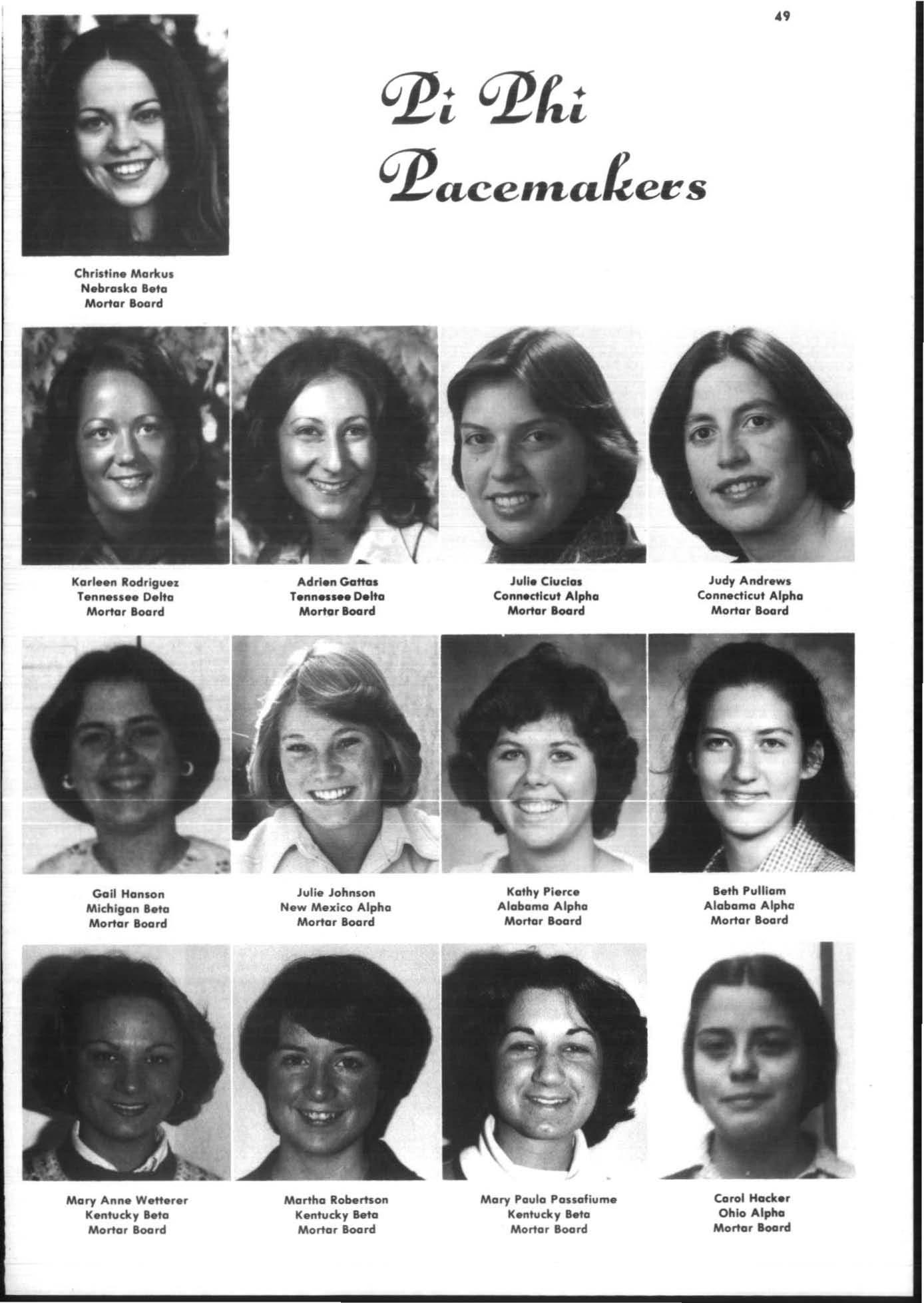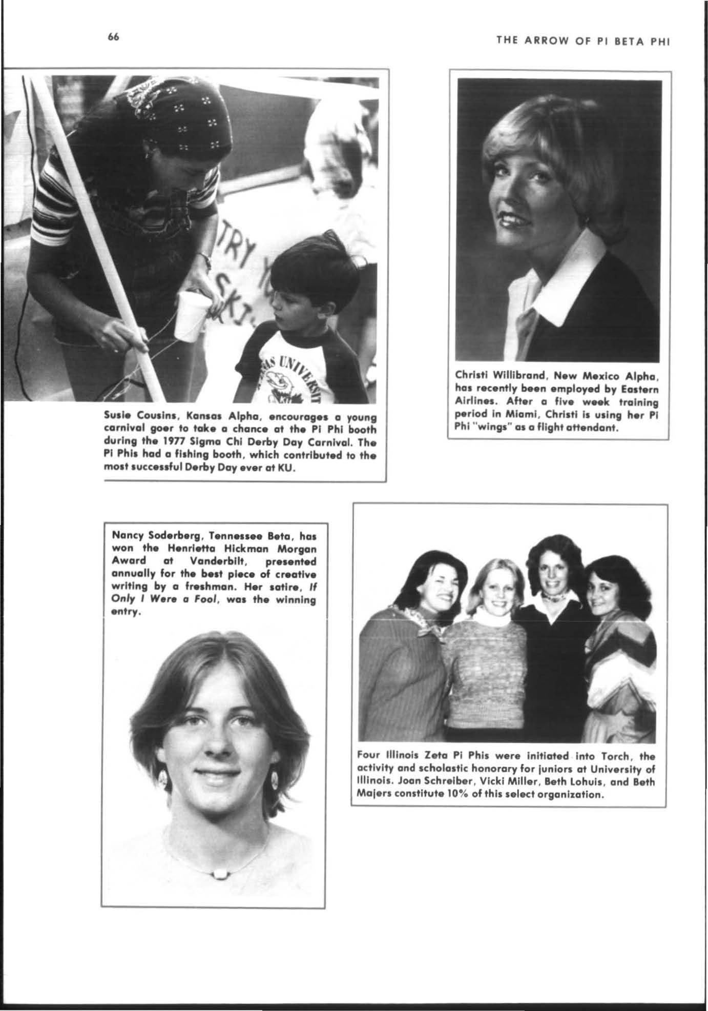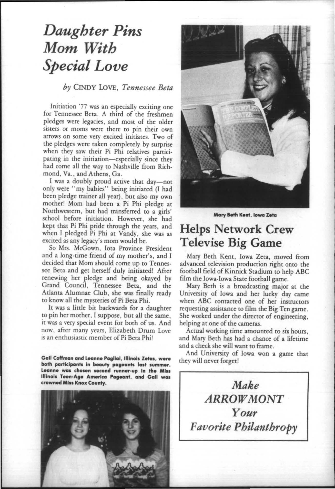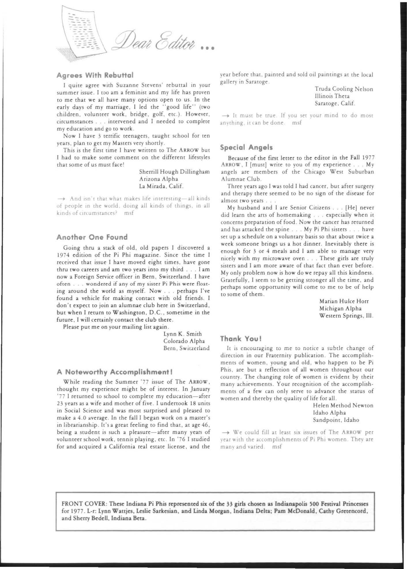 FRONT COVER: These Indi2n2 Pi Phis reprc=sentc=d six of the H girls chosen a.s Indianapolis )00 Festival Prinec=sses for 1977. L·r: Lynn W2ujes. Leslie S2rkesian, and Linda Morgan , Indiana Delta; Pam McDona.ld Cathy Gretencord. 2nd Sherry Bc:dell , Indi ana Bc:ta