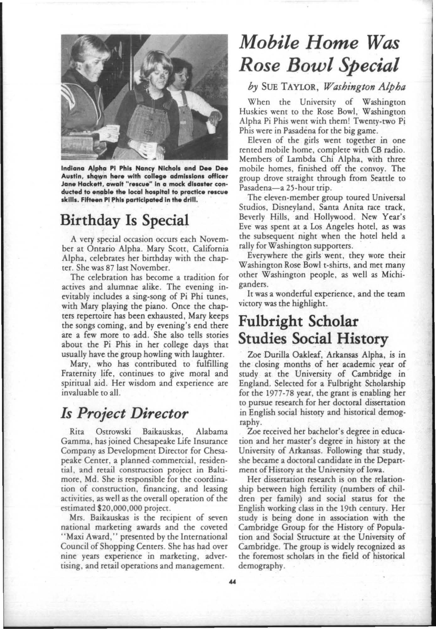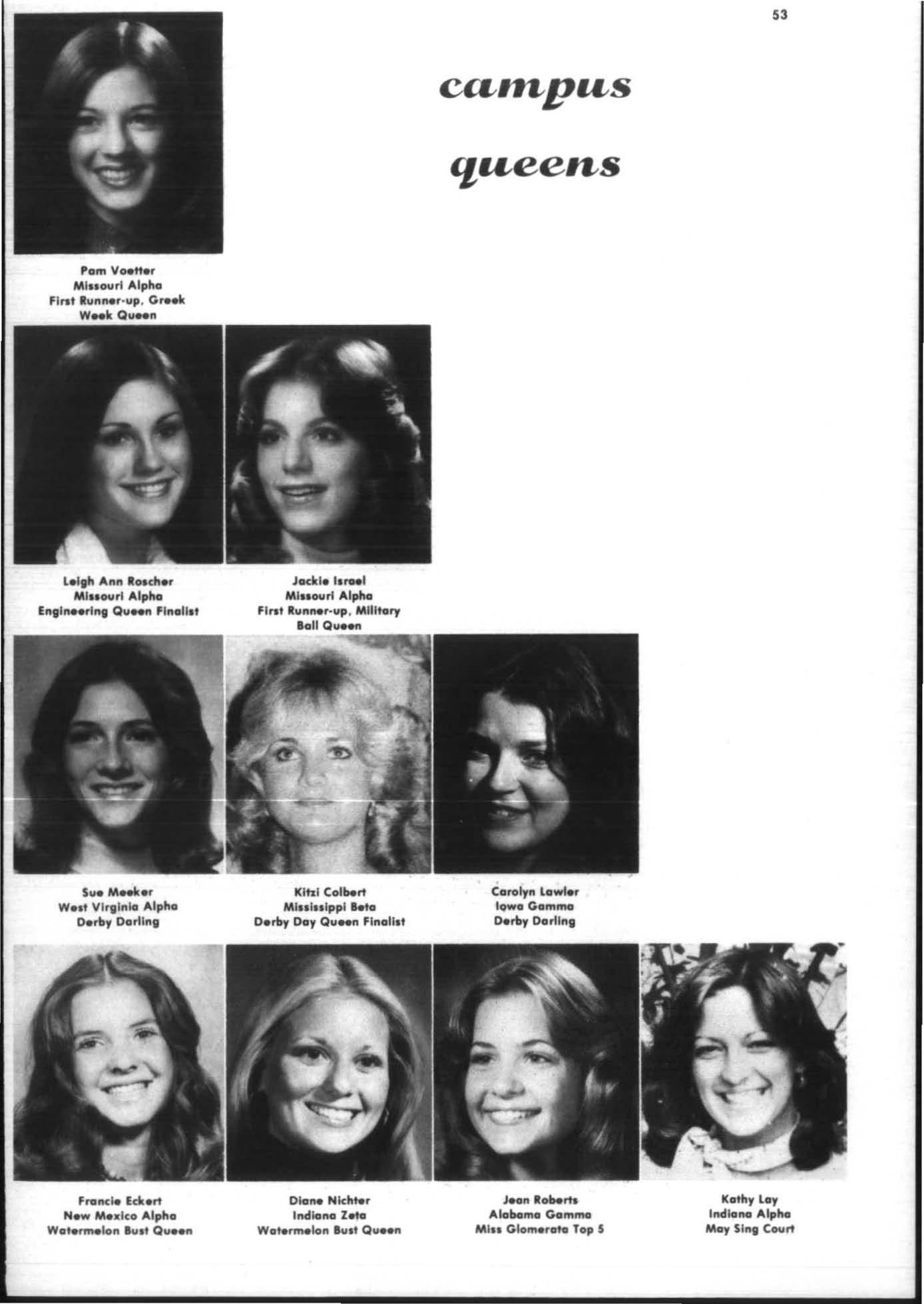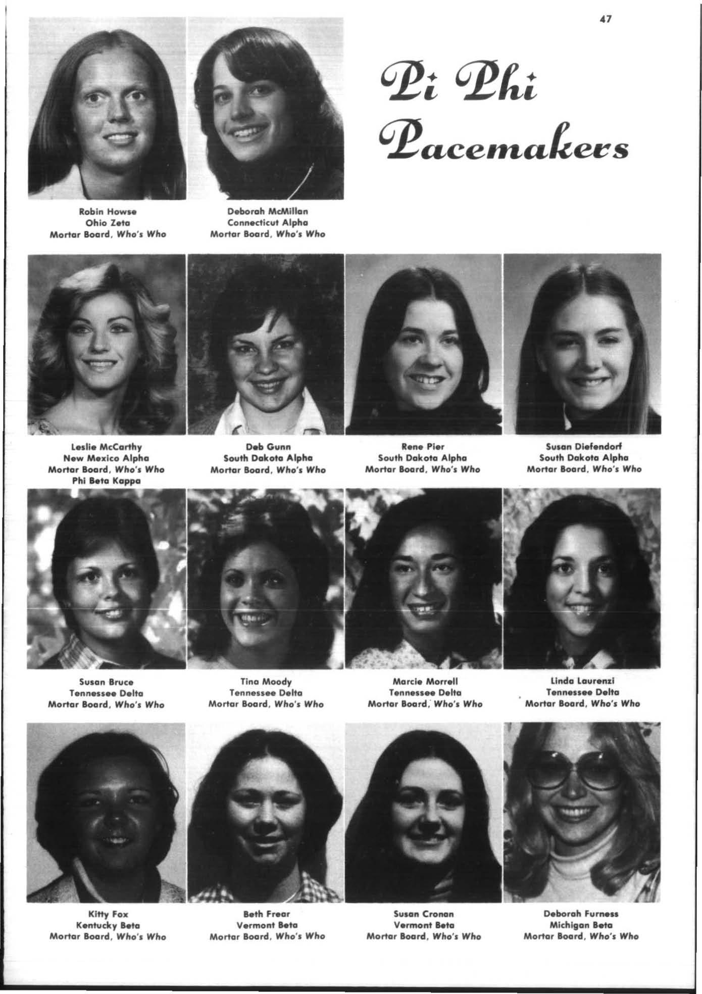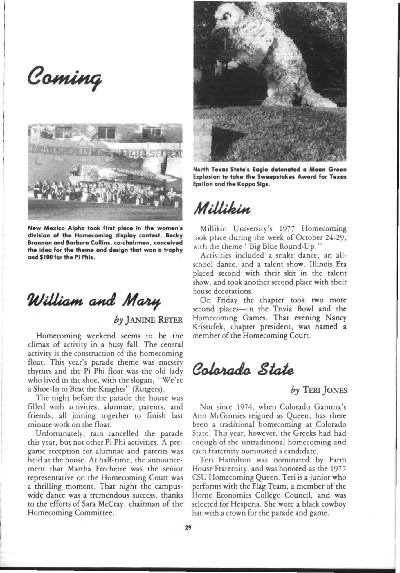 FRONT COVER: These Indi2n2 Pi Phis reprc=sentc=d six of the H girls chosen a.s Indianapolis )00 Festival Prinec=sses for 1977. L·r: Lynn W2ujes. Leslie S2rkesian, and Linda Morgan , Indiana Delta; Pam McDona.ld Cathy Gretencord. 2nd Sherry Bc:dell , Indi ana Bc:ta