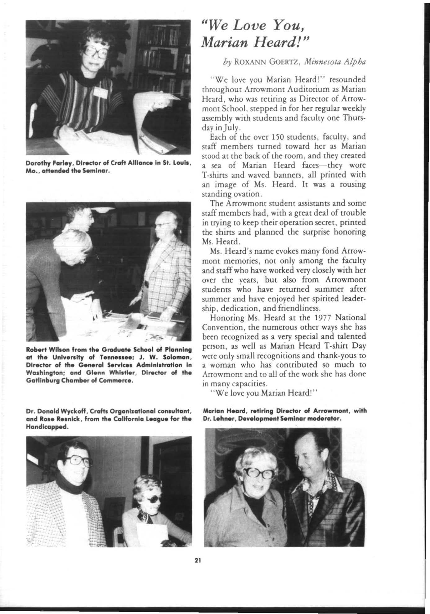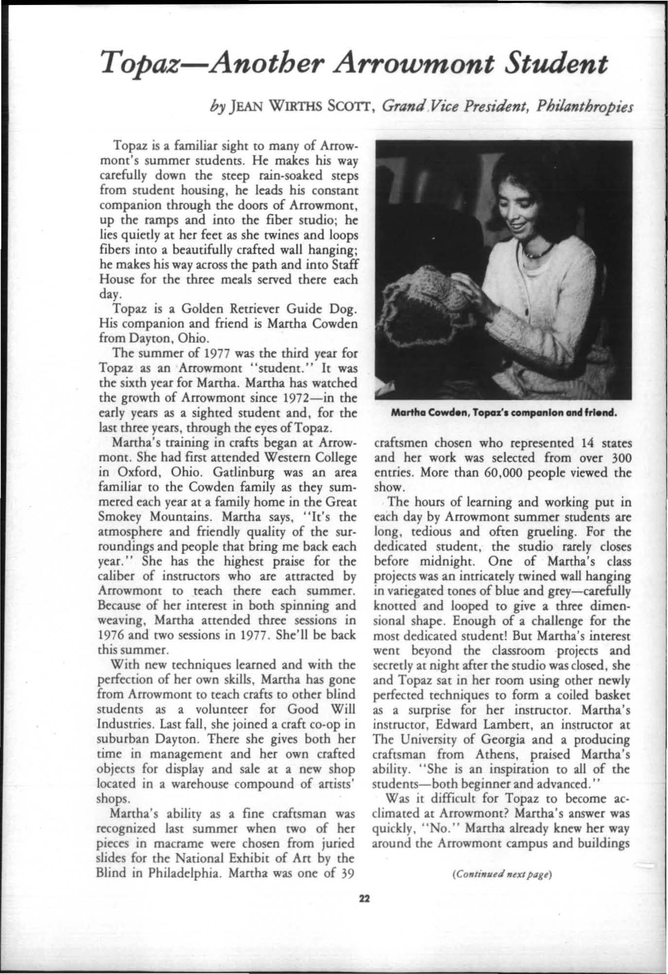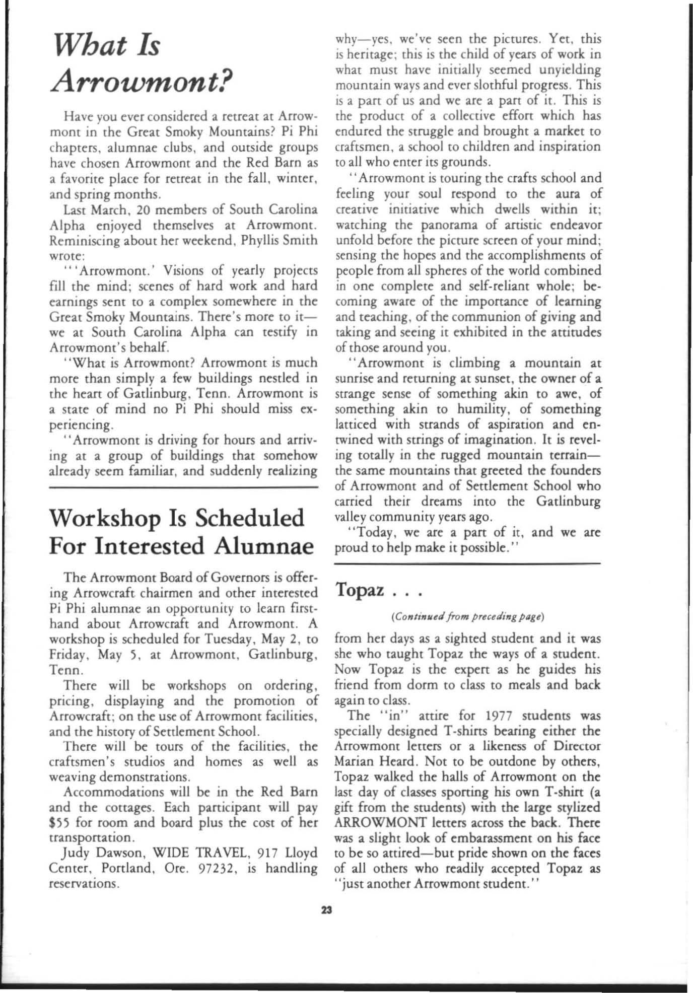 While rc=ading Ihe Summer '77 issue of The ARROW, thought my experiencc= might be of interest. In January '77 I rC=lUrnc=d to school to complc=tc= my c=ducation - after B yc=ars as a wifc= and mothc=r of fivc= I undc=rtook 18 units in Social Scic=ncc= and was most surprisc=d and plc=ased to makc= a 4 0 in thc= faJli began work o n a master's in librarianship 1t '52 gre2t fc=cling to find that, 201 age 46, being a Studc=nt is suc h a pleasure - aftc=r many yc=ars of volunteer sc hool work , tennis playing, etc. In '76 I studied fo r and acqujrc=d a Ca l ifornia real estate license , and the