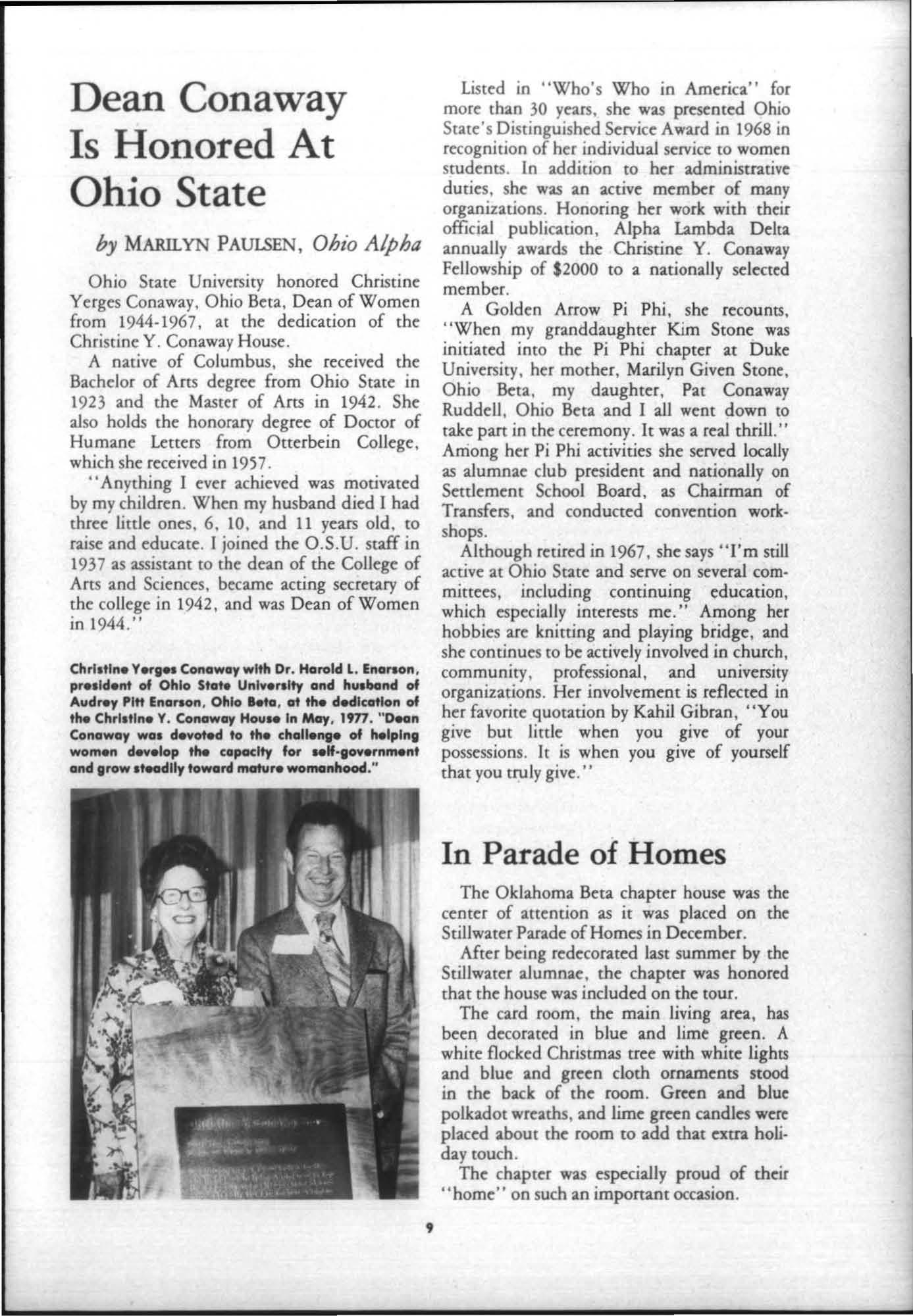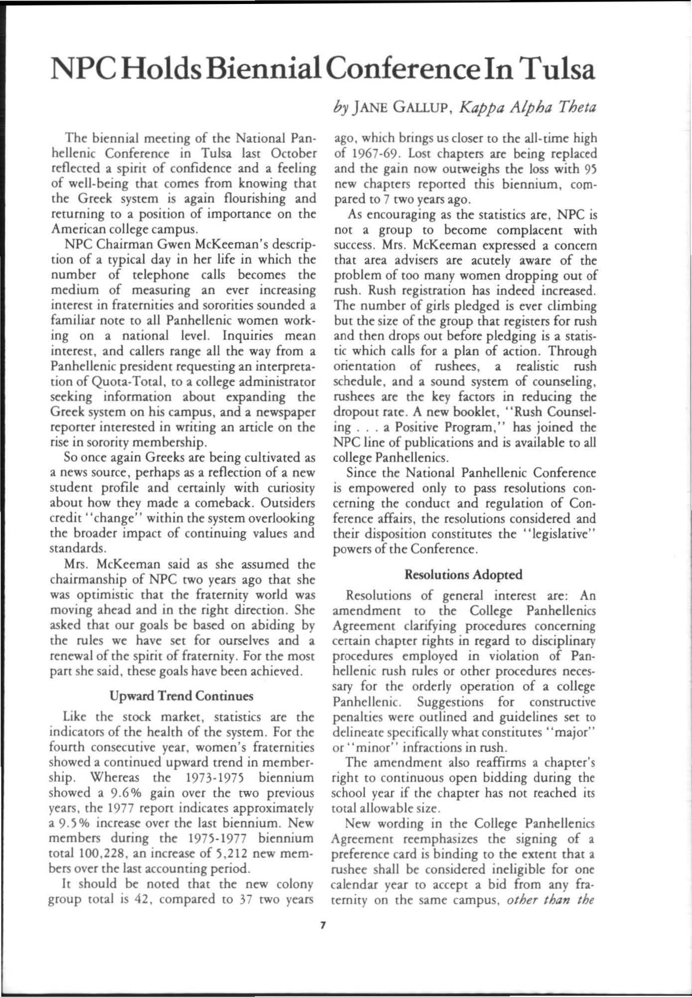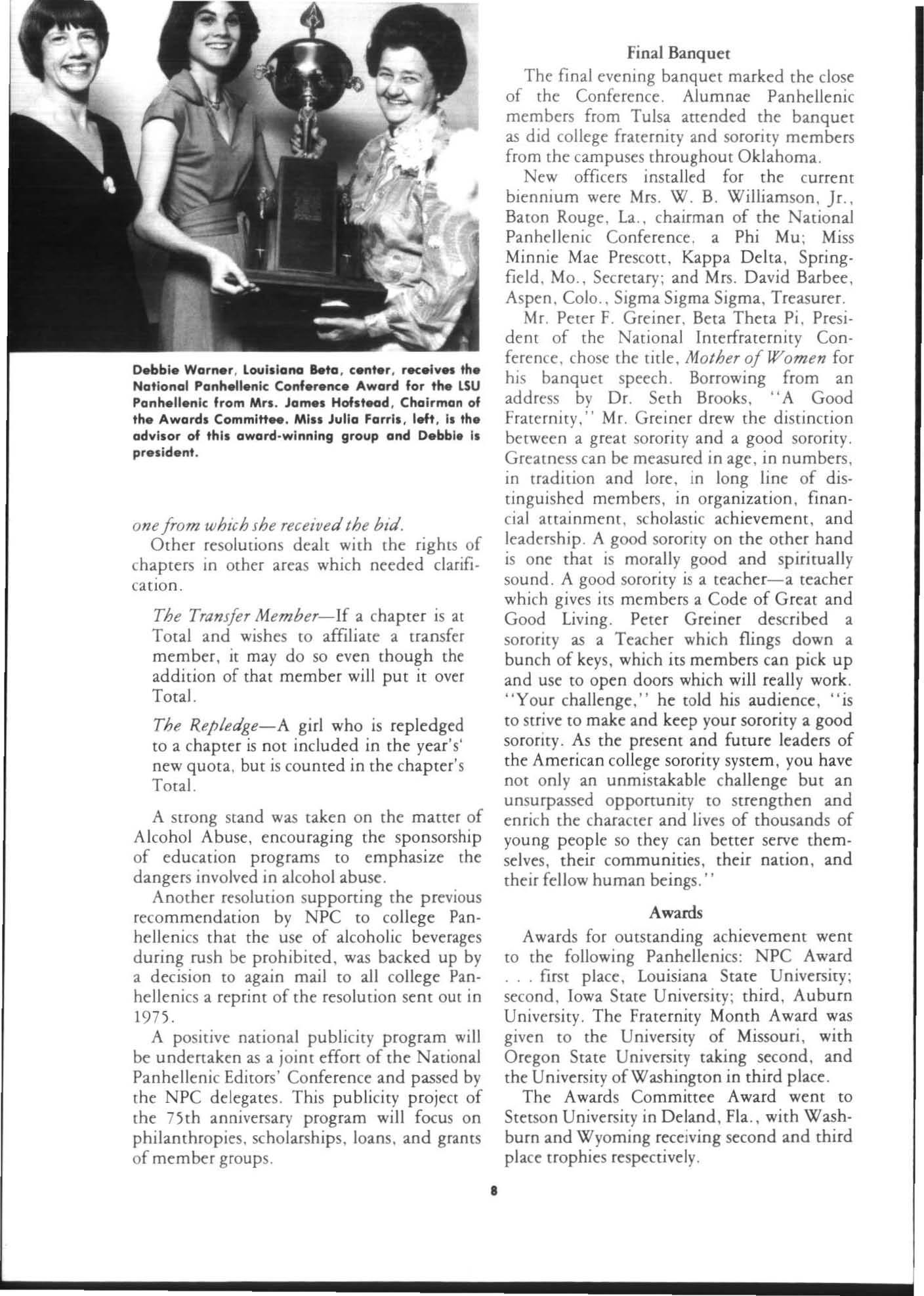 Those P, PhIS who attended the final banquet at the National Panhellen,c Conference In Tulsa In October were popping the" buttons when the awards were announced The NPC Award is presented to the outstanding Panhelleni c on a campus with seven or more national sorO fmes , and winner this year was Louisiana State. ot which Pi Phi Debbie \){'<UIlf:1 I) PIC:tlJCIIL Second place In ,he ,.me tategory went to Iowa State. of whICh Pi Ph, Barbara Lacke is preSIdent OUf congratuJauons (0 these two fine groups. as well as to thelf adVISOrs. Miss Julta Farris at LSU. and Mrs. Frank Snyder at Iowa State