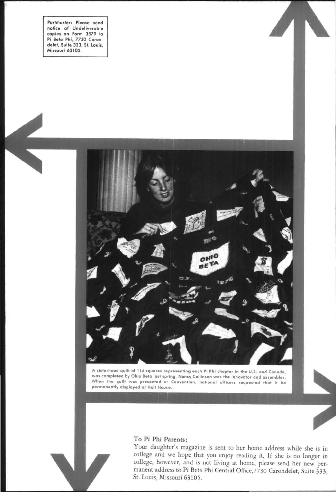 To Pi Phi Parents: Your daughter's magazine is sent to her home address while she is in college and we h o pe th at you enjoy reading it. If she is no longer in co lle ge, however, and is not li ving at home. p lease send her new permanent address to Pi Beta Phi Cen t ral Ollice,7730 Caronde let, Suite 333, St. Louis, Mi ssou ri 63105.