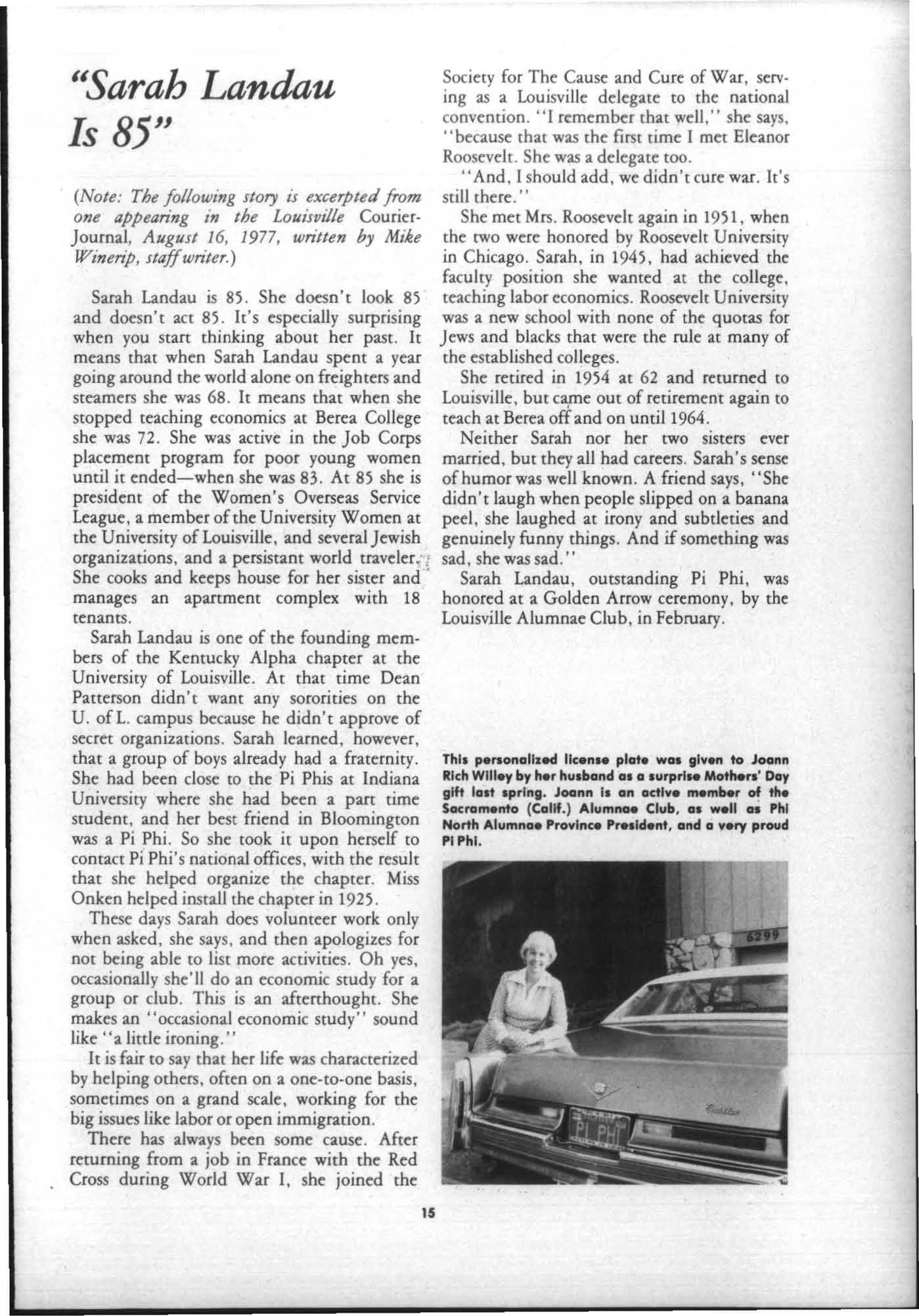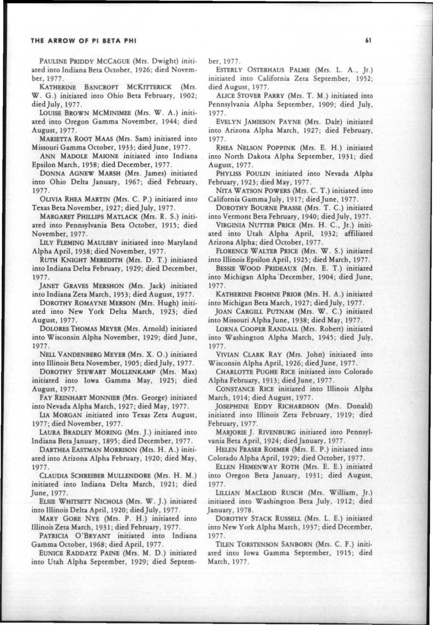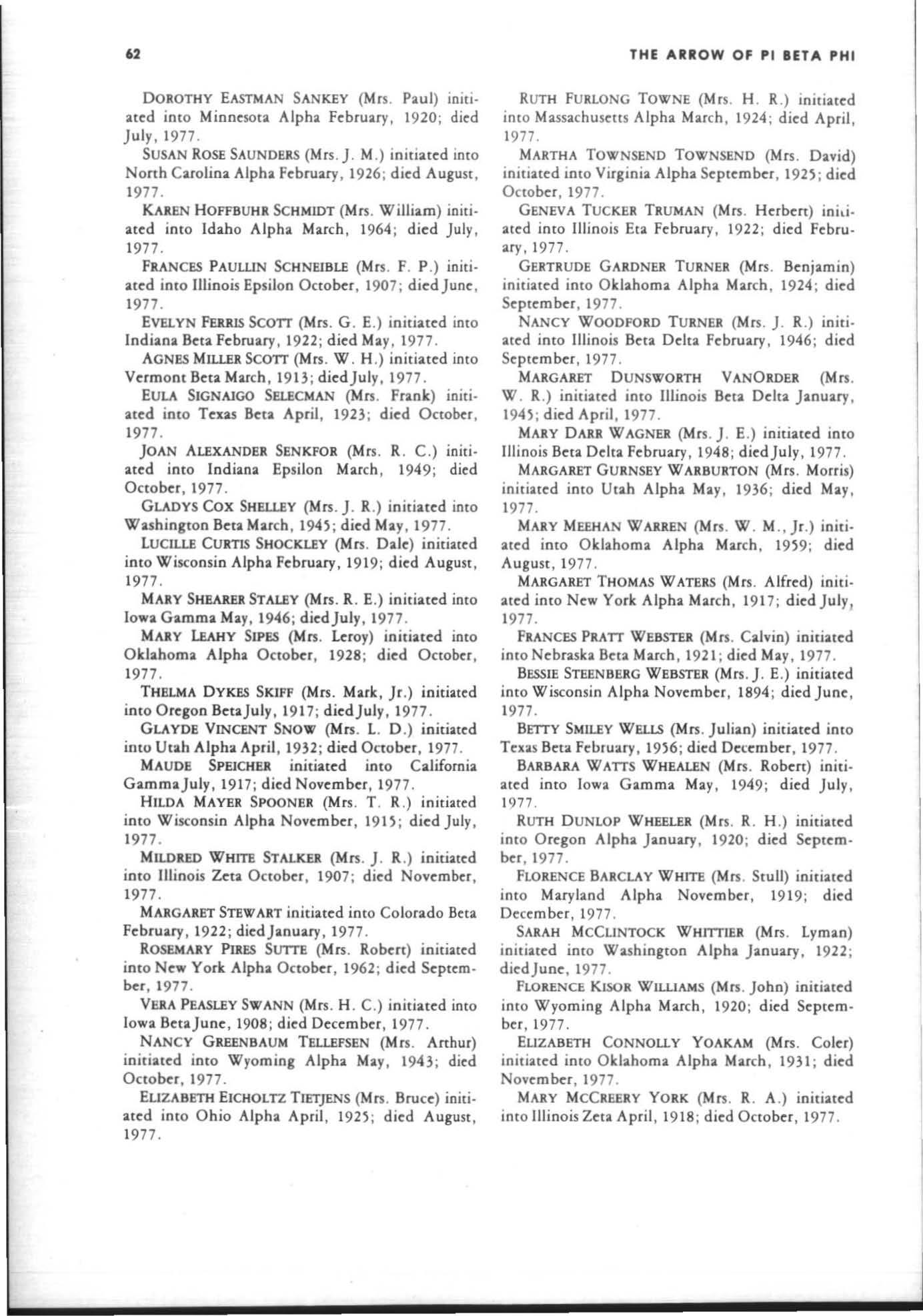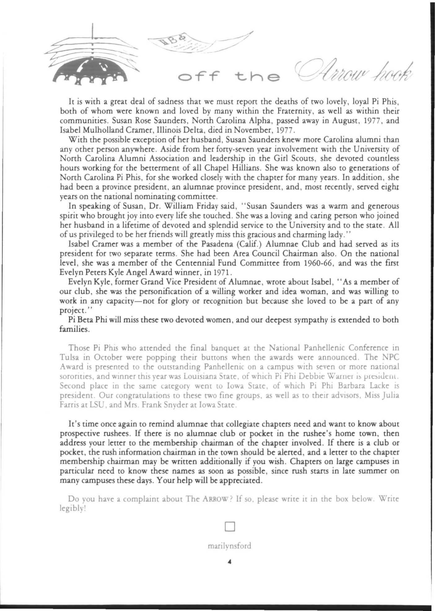It is with a great deal of sadness that we must report the deaths of twO lovely . loyal Pi Phis . both of whom were known and lo ved by many within the Fraternity as well as within their communities. Susa n Rose Saunders. North Carolina Alpha passed away in August 1977. and Isabel Mulholland Cramer. Illinois Delta. died in November. 1977.