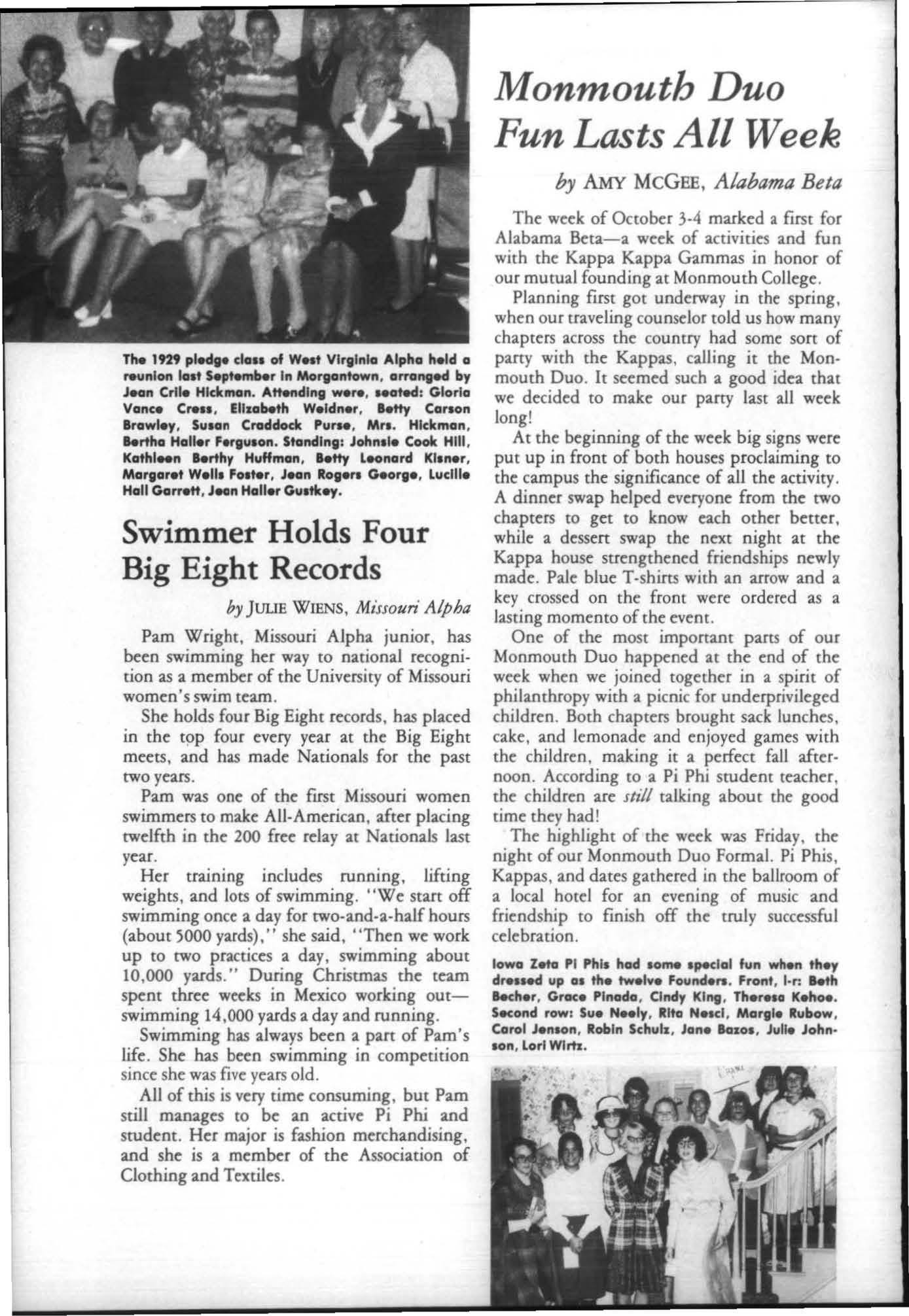 The festivities began wirh the a rri val of Mary Ann Olinger, Dire ctor of Extension , and Nancy Pollock . National Panhellenic Conference Delegate. on Tuesday evening. The y were the advance rask force On Wednesday rhe other members of Grand Council arrived . On Wednesday evening Waco Pi Phi alumnae hosted a dinner parry for Grand Council and visiting dignitaries .