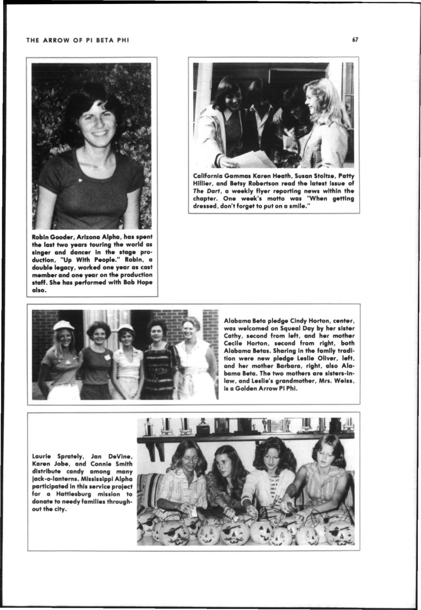 Alabama Beta pledg_ Cindy Horton cent.r. was wekom.d on SquMI Doy by h.r ,I,t., Cathy second from left and h., mother Cecil. Horton , second from right, both Alabama letal Sharing In the family tradl· tlon w.r. new pl.dge L.slI. Oll".r , left , and h.r moth.r Barbaro right , also Ala· bama leta Th. two mothe are slst.,.·ln· law, and L.slI.' s grandmoth.r , M... . W.I .. . Is a Golden Arrow PI Phi