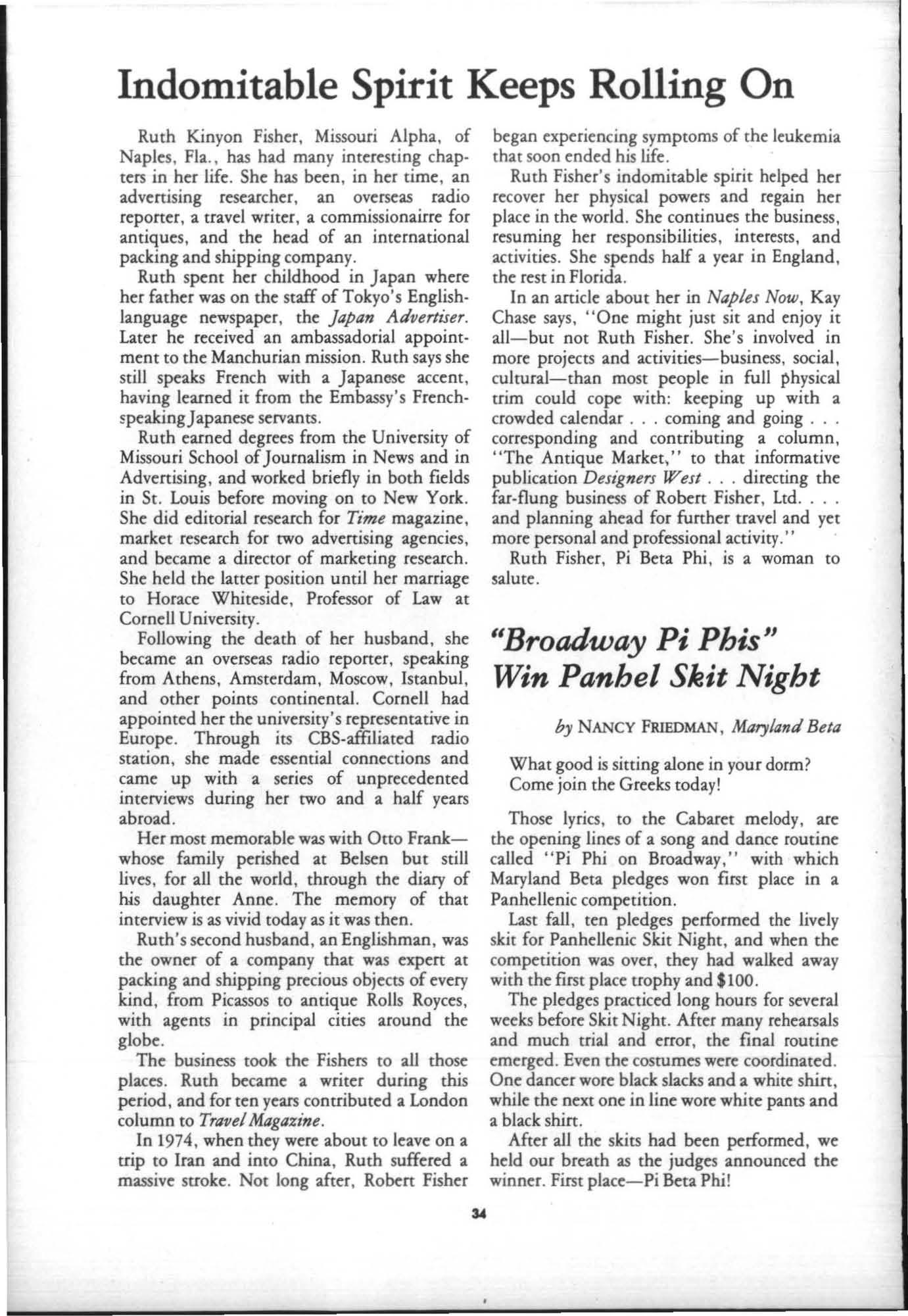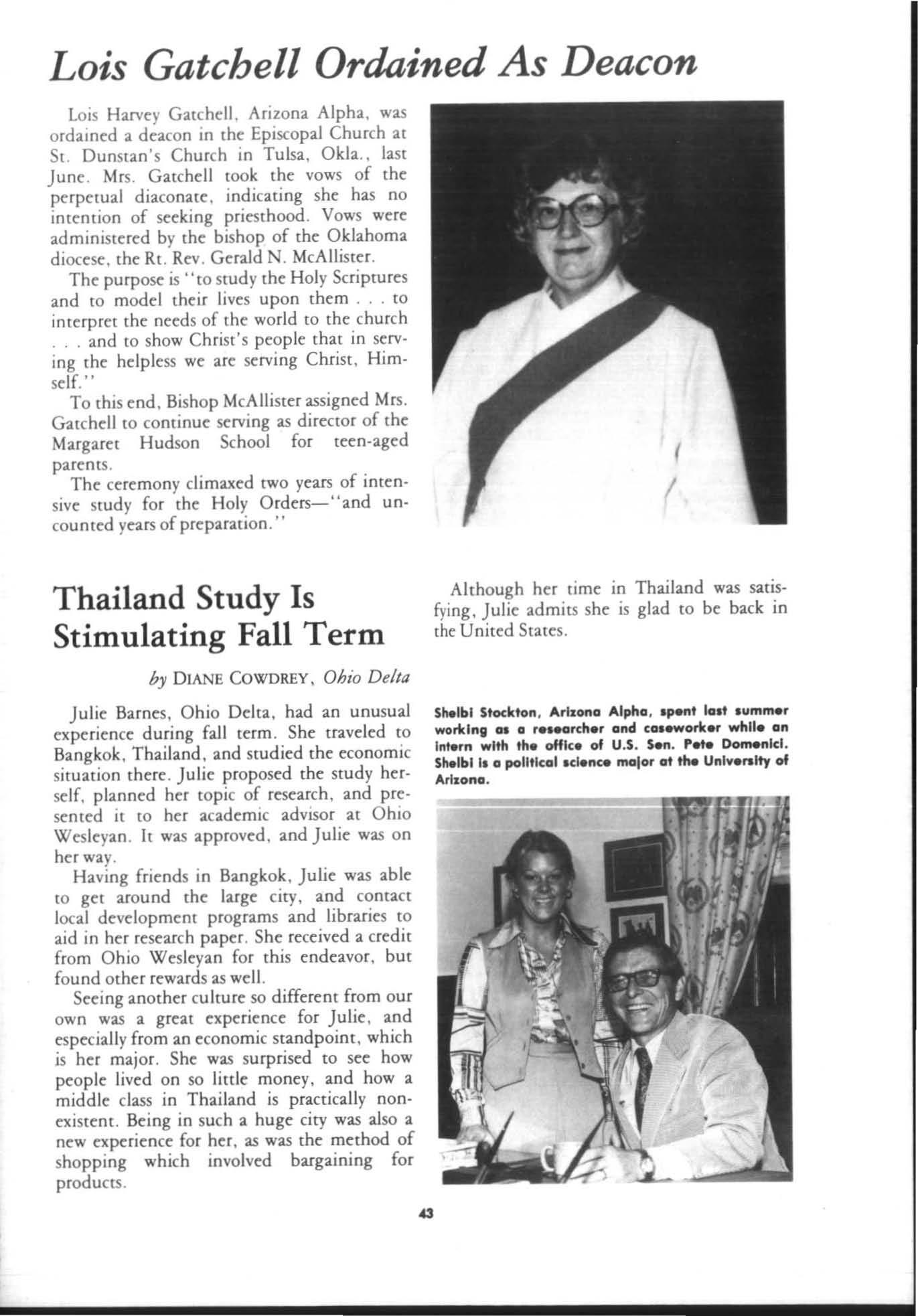 Going tnru a stack of old, old papers I discovered a 1974 edition of tne Pi Phi magazine Since the time I received that issue I have moved eight times, have gone thru tWO ca ree rs and am tWO years imo my third I am now a Foreign Service officer in Bern , Switzerland I have often wondered if any of my siSter Pi Phis wcre flOlUjng around the world as mysdf. Now perhaps I've found a vehicle for making co n taCt with o ld friends. I don ' t expect to jo in an alumnae club here in Switzc= rl3nd , but whc=n I relUrn 10 W2shington, D C., sometime in the future , I will certainly comact the club t here
