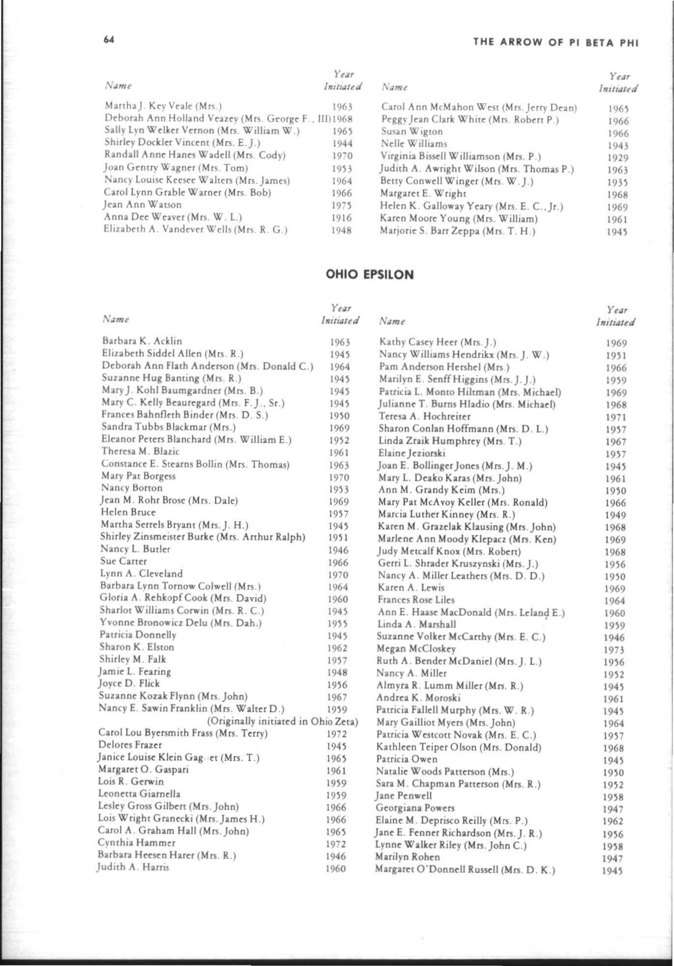 Susan Jane Kaighin Waterman ( Mrs ThomasJ ) 1964 O riglOally IOltiated In Colorado Ga mm a Barbal"2o Ma rs hall While ( Mrs Ronald W ) 196 8
