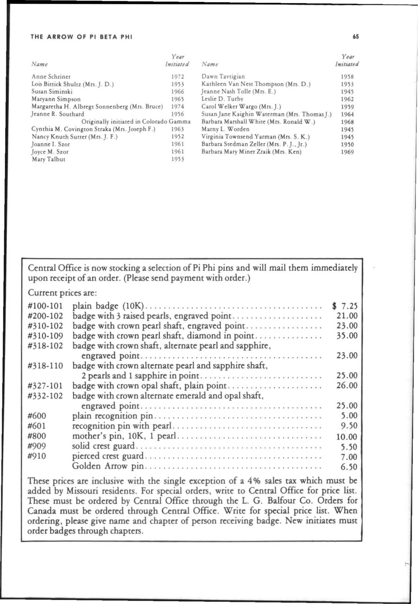 These prices are inclusive wirh rhe single exception of a 4 % sales tax which must be added by Missouri residents For special orders , write to Central Office for price list. These must be ordered by Central Office rhrough rhe L. G. Balfour Co. Orders for Canada must be ordered rhrough Central Office. Write for special price list. When ordering, please give name and chapter of person receiving badge New initiates must order badges through chapters.