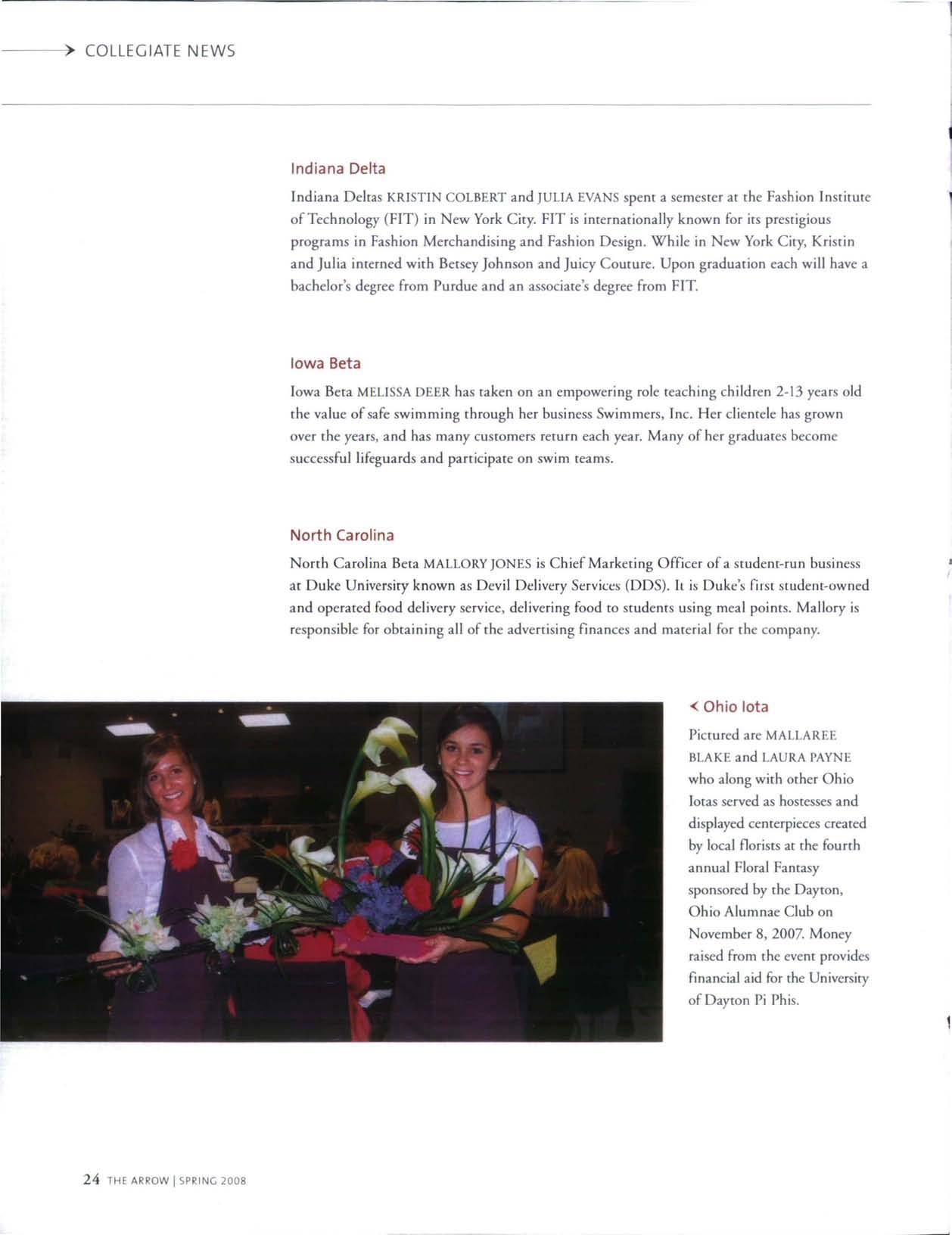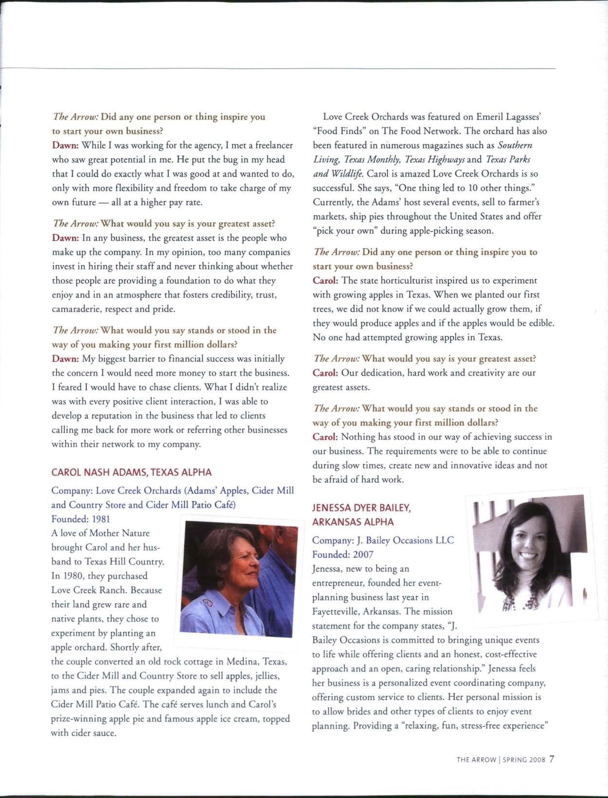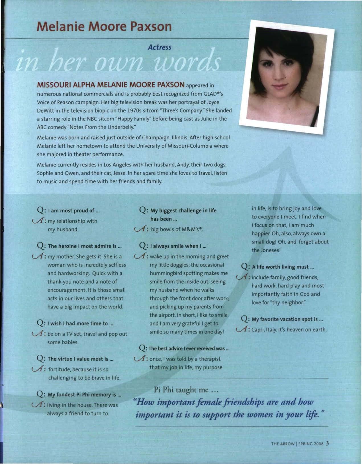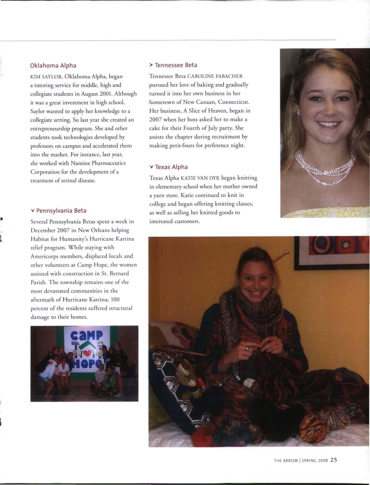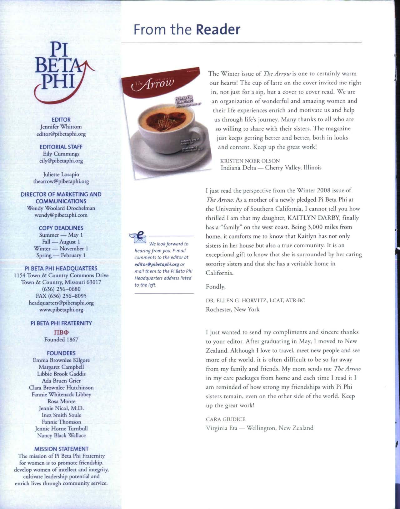 I just wanted to send my compliments and sincere thanks to your editor. After graduating in May, I moved to New Zealand . A lthough I love to travel , meet new people and see more of t he world , it is often difficult to be so far awa y from my family and friends. My mom sends me The Arrow in my ca re packages from home and each time I read it I am remi n ded of how strong my friendships with Pi Phi s isters remain , even on the other side of the world. Keep up the great work!