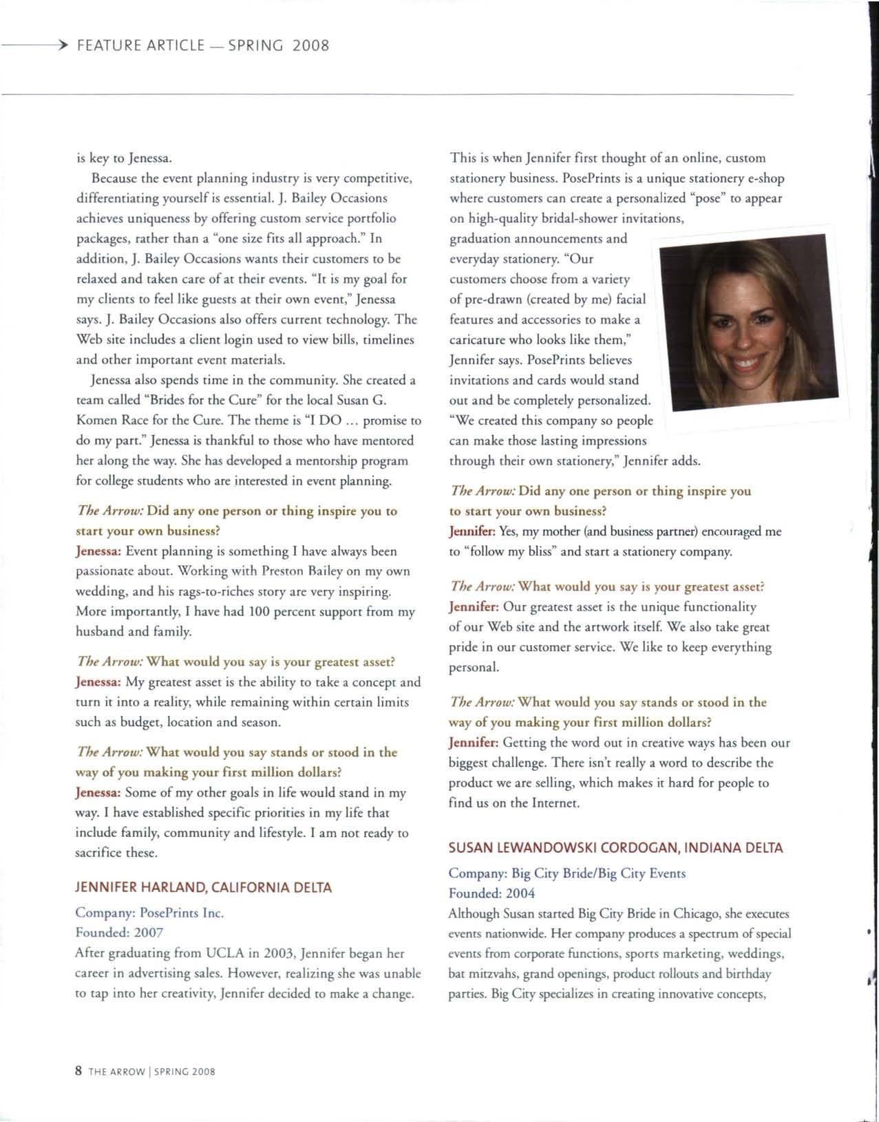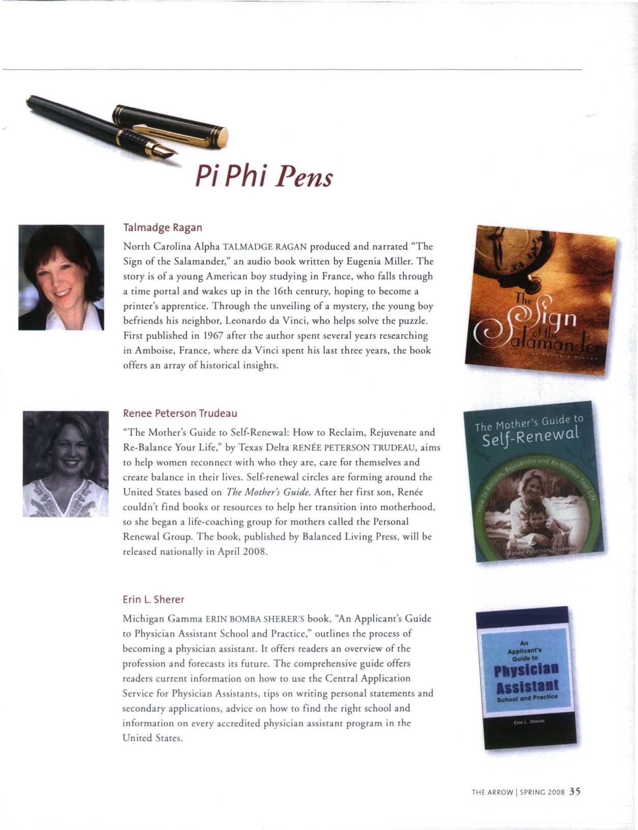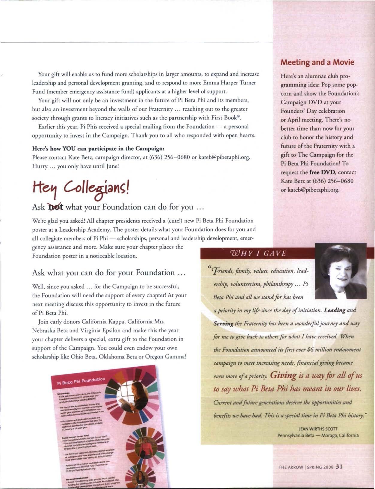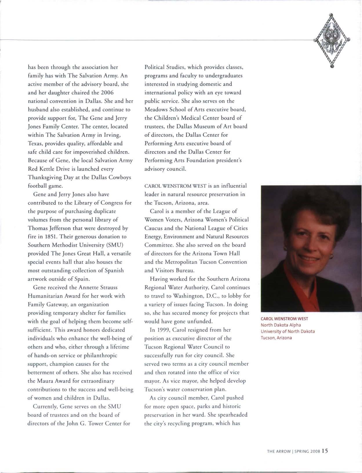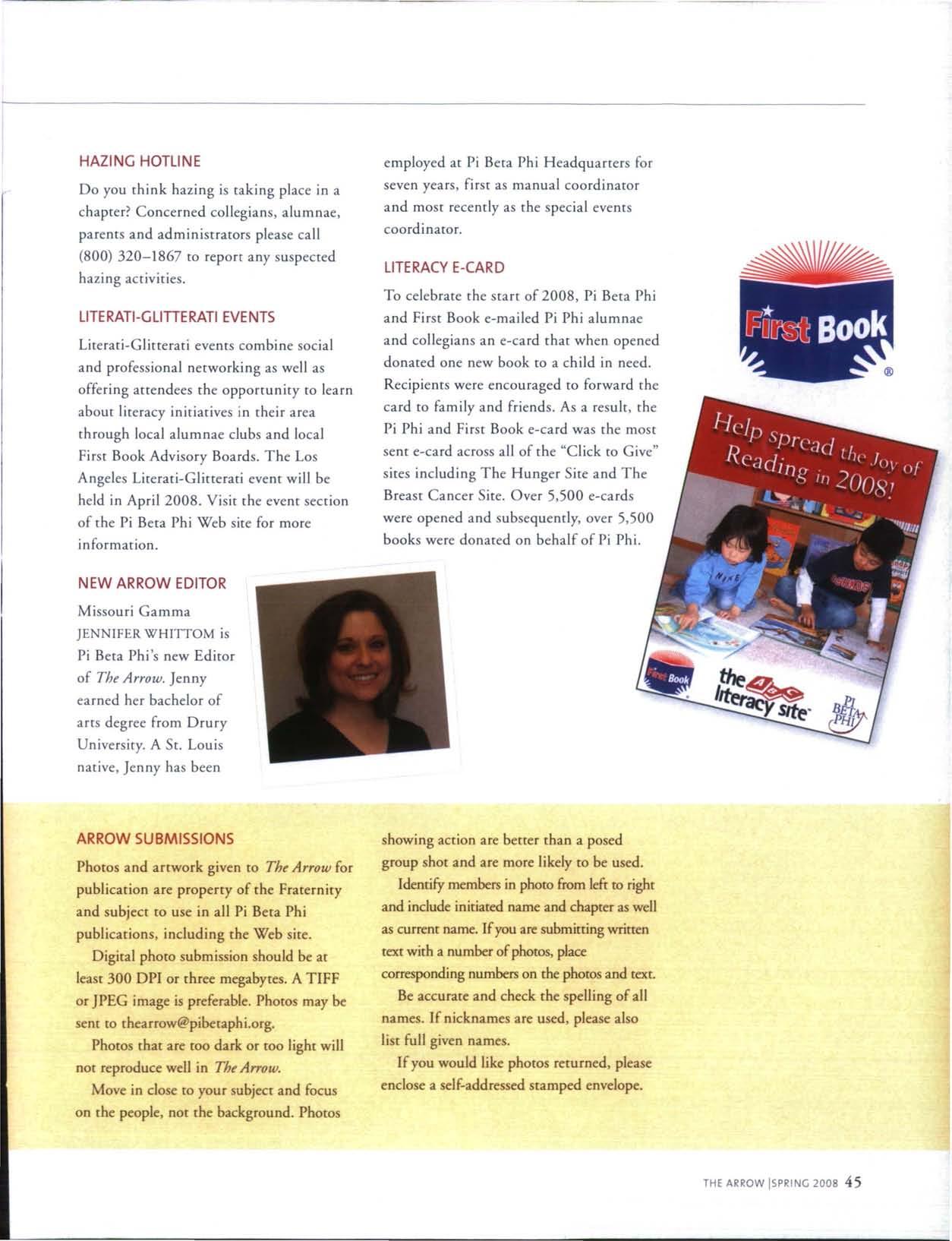 I just wanted to send my compliments and sincere thanks to your editor. After graduating in May, I moved to New Zealand . A lthough I love to travel , meet new people and see more of t he world , it is often difficult to be so far awa y from my family and friends. My mom sends me The Arrow in my ca re packages from home and each time I read it I am remi n ded of how strong my friendships with Pi Phi s isters remain , even on the other side of the world. Keep up the great work!