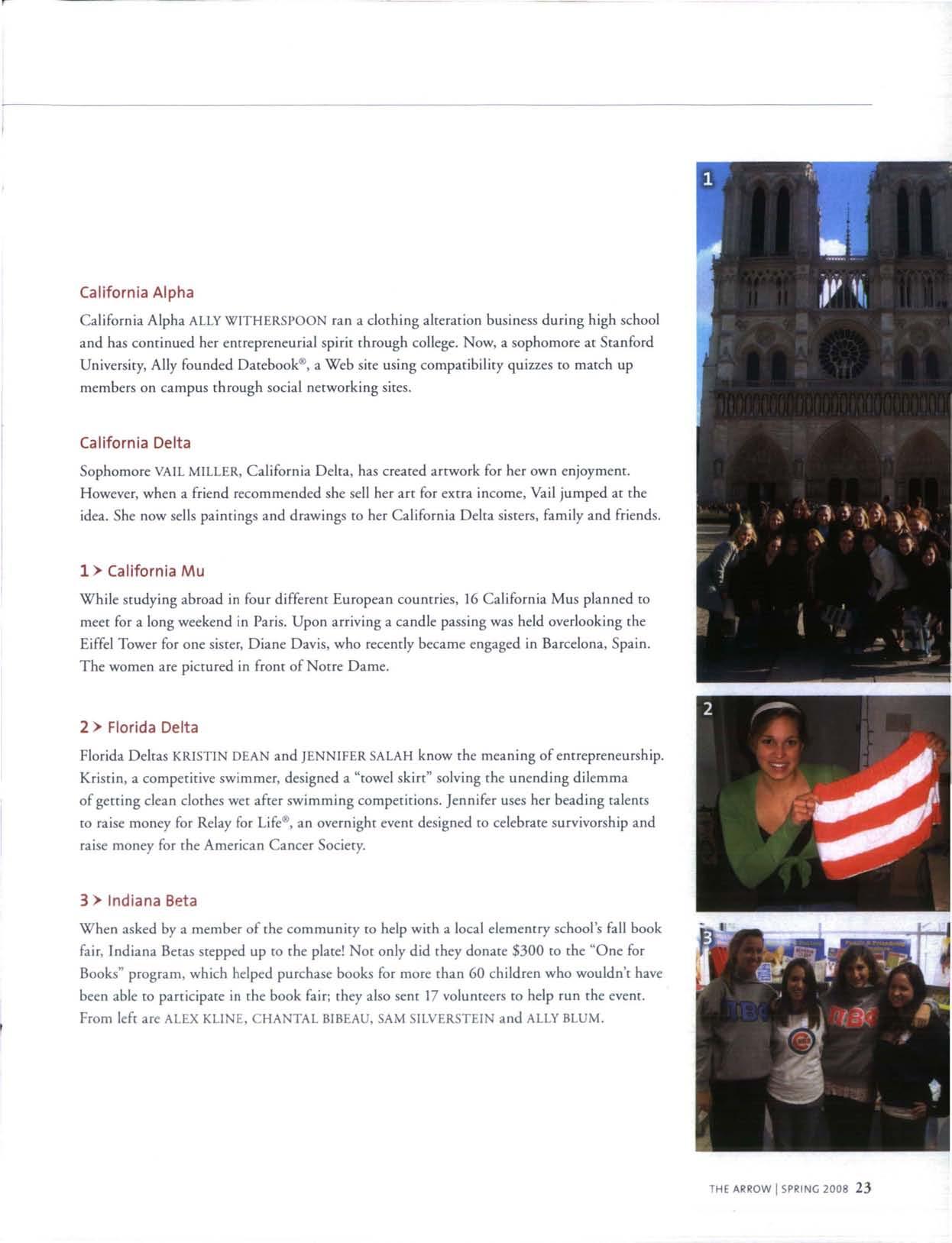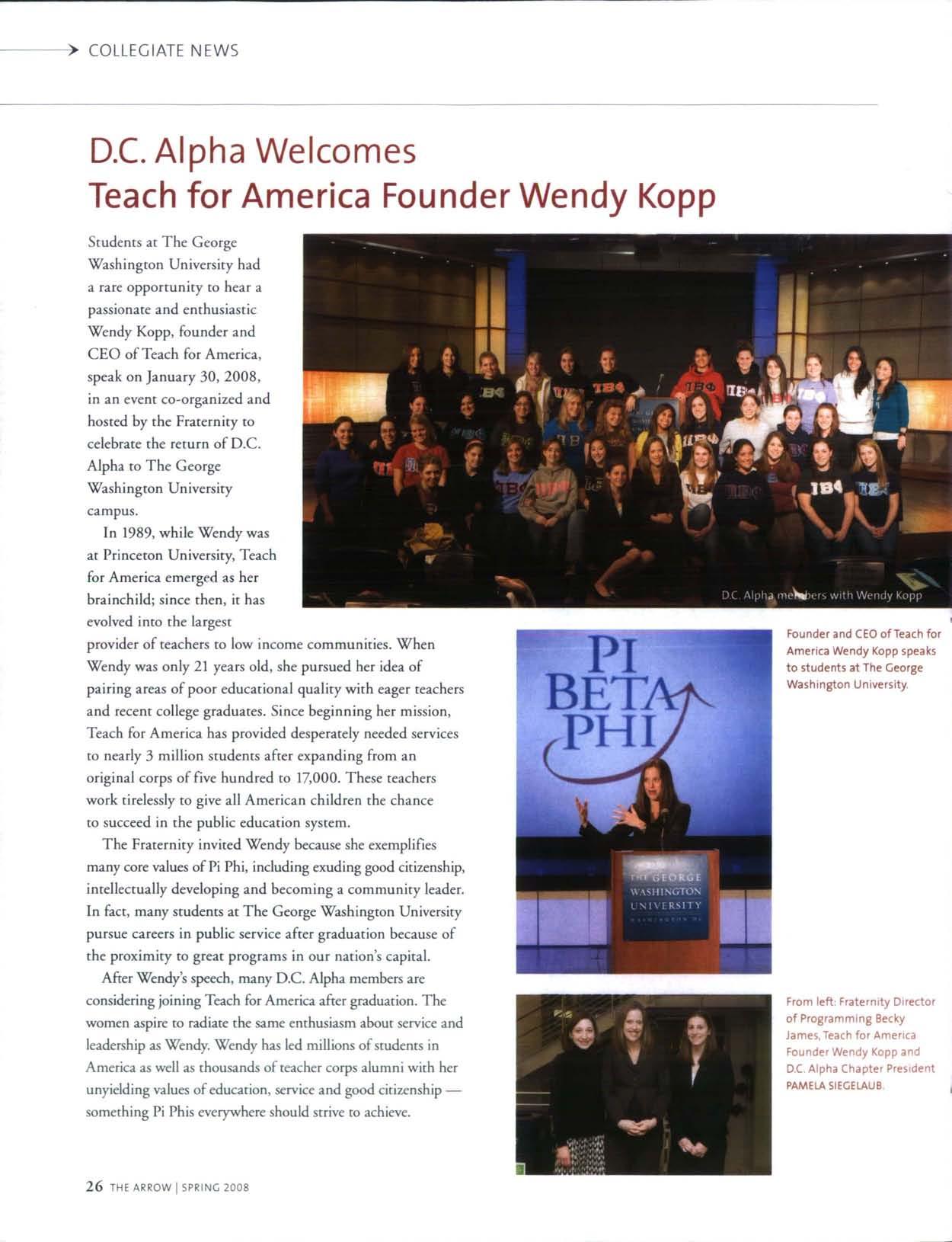 I just read the persp ective from the Winter 2008 issue of The Arrow As a mother of a newly pledged Pi Beta Phi at the University of Southern California, I cannot tell you how thrilled I am that my daughter, KAITLYN DARBY, finally has a " fami ly" on the west coast. Being 3,000 miles from home, it comforts me to know that Kaitlyn has not only sisters i n her house but also a true community. It is an exceptional gift to know that she is surrounded by her caring sorority sisters and that she has a veritable hom e in California.