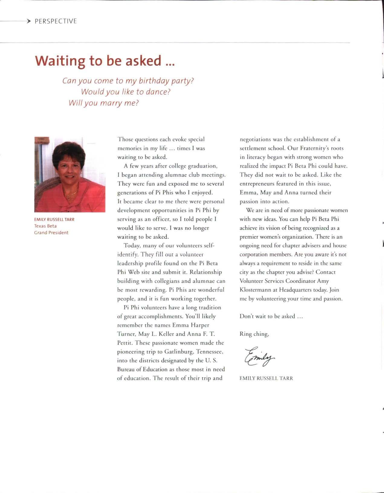 A few years after college graduation , I began attending alumnae club meetings. They were fun and exposed me to several generations of Pi Phis who I enjoyed. It became clear to me there were personal development opportunities in Pi Phi by serving as an officer, so I told peop le I would like to serve. I was no longer waiting to be asked.