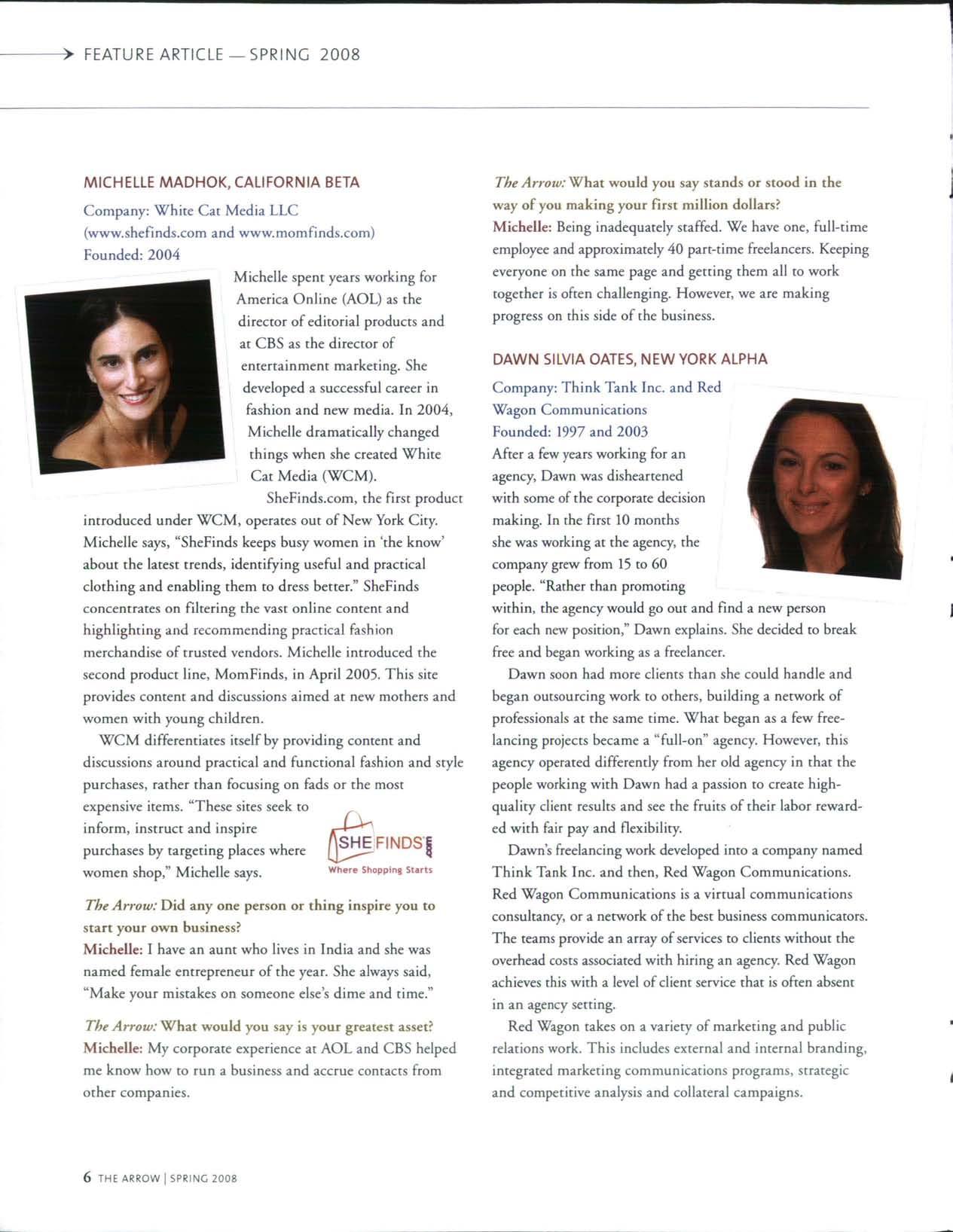 Michelle spent years working for America Online (AOL) as the director of editorial products and at CBS as the director of entertainment market ing. She developed a successfu l career in fashion and new media. In 2004, Michelle dramaticall y changed things when she created White Cat Media (WCM ). SheFinds.com, th e first product introduced under WCM , operates out of New York City. Michelle says, "SheFinds keeps busy women in 'the know' about the latest trends, identifying useful and practical clothing and enabling them to dress better." SheFinds concentrates on filtering the vast online content and highlighting and recommending practical fash ion merchandise of trusted vendors. Michelle introduced the second product line, Mom Finds, in April 2005. This site provides content and discussions aimed at ne w mothers and women with young children.