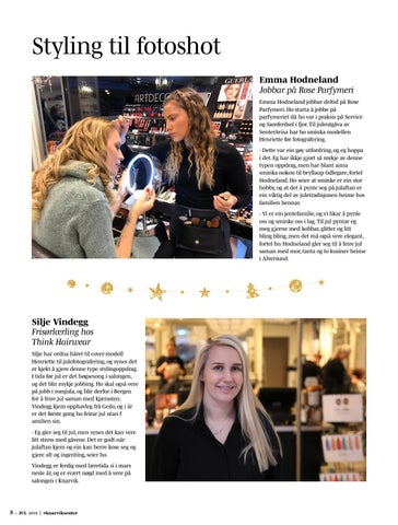 Silje Vindegg Frisørlærling hos Think Hairwear Silje har ordna håret til cover-modell Henriette til julefotografering, og synes det er kjekt å gjere denne type stylingoppdrag. I tida før jul er det høgsesong i salongen, og det blir mykje jobbing. Ho skal også vere på jobb i romjula, og blir derfor i Bergen for å feire jul saman med kjærasten. Vindegg kjem opphavleg frå Geilo, og i år er det første gong ho feirar jul utan f amilien sin. - Eg gler seg til jul, men synes det kan vere litt stress med gåvene. Det er godt når julaftan kjem og ein kan berre kose seg og gjere alt og ingenting, seier ho. Vindegg er ferdig med læretida si i mars neste år, og er svært nøgd med å vere på salongen i Knarvik.