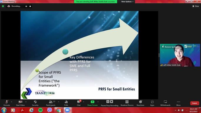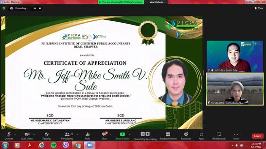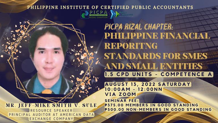 PICPA Rizal Chapter for the fiscal year 2022-2023 conducted its first webinar during this pandemic. The seminar entitled “Philippine Financial Reporting Standards for SMEs and Small Entities” was conducted with Resource Speaker, Mr. Jeff-Mike Smith V. Sule via Zoom platform. This was attended by 25 participants. The seminar was competently handled by Ms. Diana Ross Nono, Chapter Secretary, as the Moderator.
