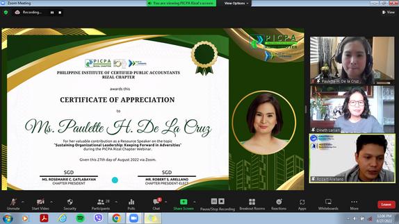 PICPA Rizal Chapter for the fiscal year 2022-2023 conducted its second webinar during this pandemic. The seminar entitled “Sustaining Organizational Leadership: Keeping Forward in Adversities” was conducted with Resource Speaker, Ms. Paulette H. Dela Cruz via Zoom platform. This was attended by 27 participants. The seminar was competently handled by Ms. Dineth S, Larsen, Chapter Director for Commerce & Industry, as the Moderator.