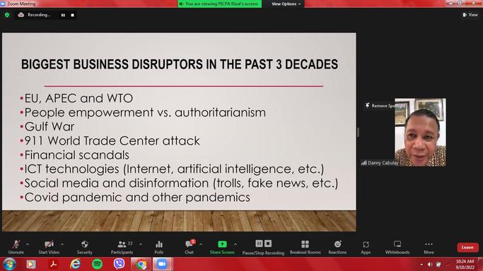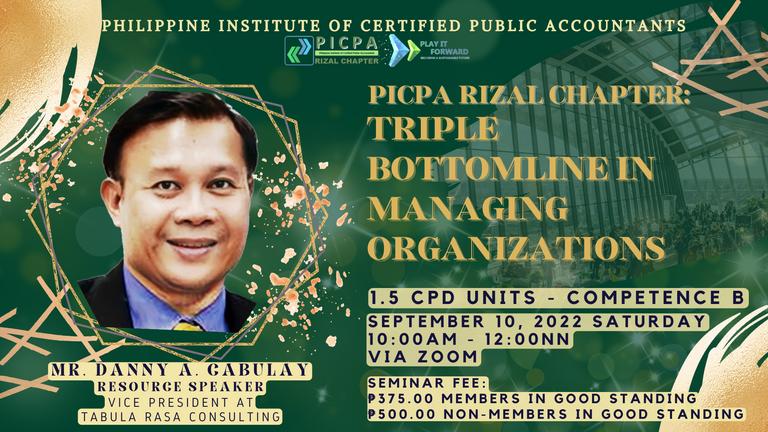 PICPA Rizal Chapter for the fiscal year 2022-2023 conducted its third webinar during this pandemic. The webinar entitled “Triple Bottomline in Managing Organizations” was conducted with Resource Speaker, Mr. Danny A. Cabulay via Zoom platform. This was attended by 33 participants. The seminar was competently handled by Ms. Connery V. Omamos, Chapter Asst. Secretary, as the Moderator.
