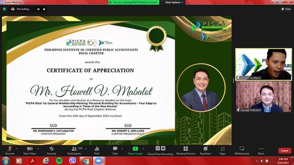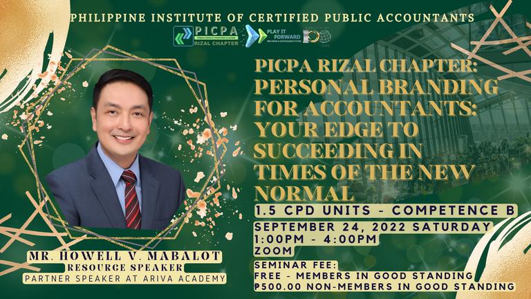 PICPA Rizal Chapter for the fiscal year 2022-2023 conducted its first general membership meeting. The said general membership meeting offered two webinars, one in the morning and one in the afternoon. The afternoon webinar is chapter’s fifth webinar during this pandemic. The webinar entitled “Personal Branding for Accountants: Your Edge to Succeeding Times in the New Normal” was conducted with Resource Speaker, Mr. Howell V. Mabalot via Zoom platform. This was attended by 173 participants. The webinar was competently handled by Ms. Dineth S. Larsen, Chapter Director for Commerce and Industry, as the Moderator. The said webinar was offered for free for members in good standing to inspire pride in being a PICPAn through branding and communications by being present in various social media platforms.