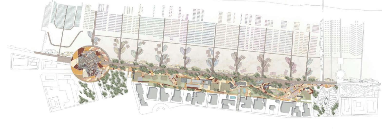 The project arises from the need to create an urban environment for Rimini and tourism of all ages, usable year-round. The idea is to create an urban park integrated with the beaches and the sea, featuring sand dunes, native vegetation, and natural materials such as wood and ceramics. Its purpose is to promote culture, wellness, and sport through various functions and activities to extend the park’s use throughout the year. Sinuous lines, colours, and wooden and ceramic pavements accompany the Waterfront walkway, connecting the city to the beach. Urban and coastal greenery creates natural shade along the path, while the sea remains constantly visible. The dunes, shaped like sardines, are the main theme and will be both sandy and earthy. Rimini’s different identities are represented in the paving along the 6 km promenade, recalling Roman Rimini, Malatesta, Fellini, folkloric traditions, motors, the colonial era, and the Belle Époque. Each square features a thematic mosaic floor visible from above, with ceramic tiles bearing bas-reliefs matching the theme.