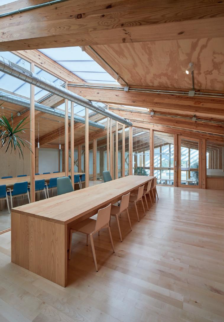 The project consists of an intervention in an existing industrial building measuring 10x30 meters in plan, aimed at creating a new large space with mixed commercial, administrative, and service uses inside. Preserving the existing perimeter walls, a system of wooden porticoes is incorporated into the interior to support a new mezzanine floor and a new roof, which, designed with a large central skylight, floods the space with zenithal light. The space is conceived as a modern wooden temple where trees are also introduced inside, recalling the origin of its wooden construction material.