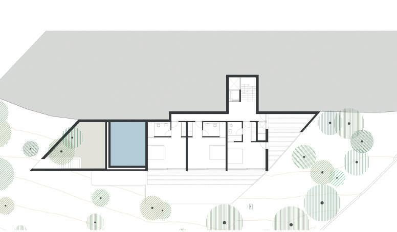 A villa conceived as a fragmented and lightweight dwelling, gently resting on an ancient agricultural terrace, following the natural slope of the land. Organized on a single level, it unfolds in a linear and porous manner, interweaving architecture and landscape, and allowing space for courtyards, trees, and voids that bring light and the forest into the interior.