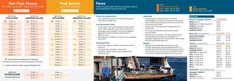 • Vehicle length is measured from the furthest protruding point at the front and/or top of the vehicle to the furthest protruding point at the rear and/or top of the vehicle and trailer. • Vehicles over 8.5 ft. wide will be charged twice the normal rate • Ferry crew can help with measurements before you buy tickets. • Vehicles over 8.5 ft. wide, 14 ft. high, and 80 ft. long must contact the ferry operator in advance. To schedule a departure time, call (253) 588–1950 or email PierceFerryAdmin@hmsgm.com.
