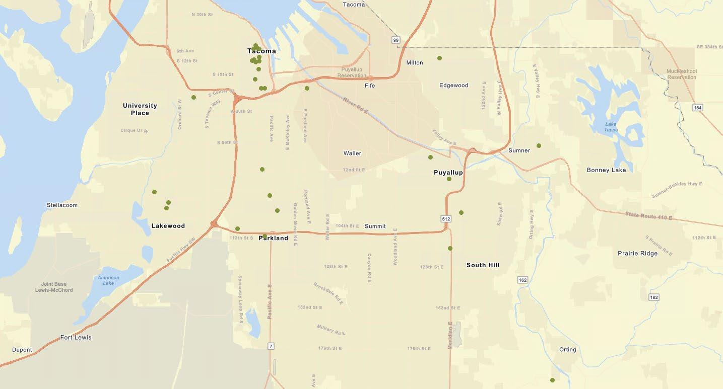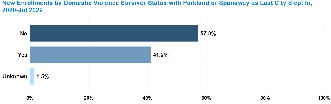 Spanaway had the 5th highest number of new enrollments from 2020-Jul 2022, while Parkland had the 7th highest. Spanaway does not currently have any permanent housing providers. However, as noted above, addresses are not maintained in HMIS and therefore may not be accurate. According to the 2020 American Community Survey, Parkland and Spanaway have the 4th and 5th largest populations in Pierce County respectively.