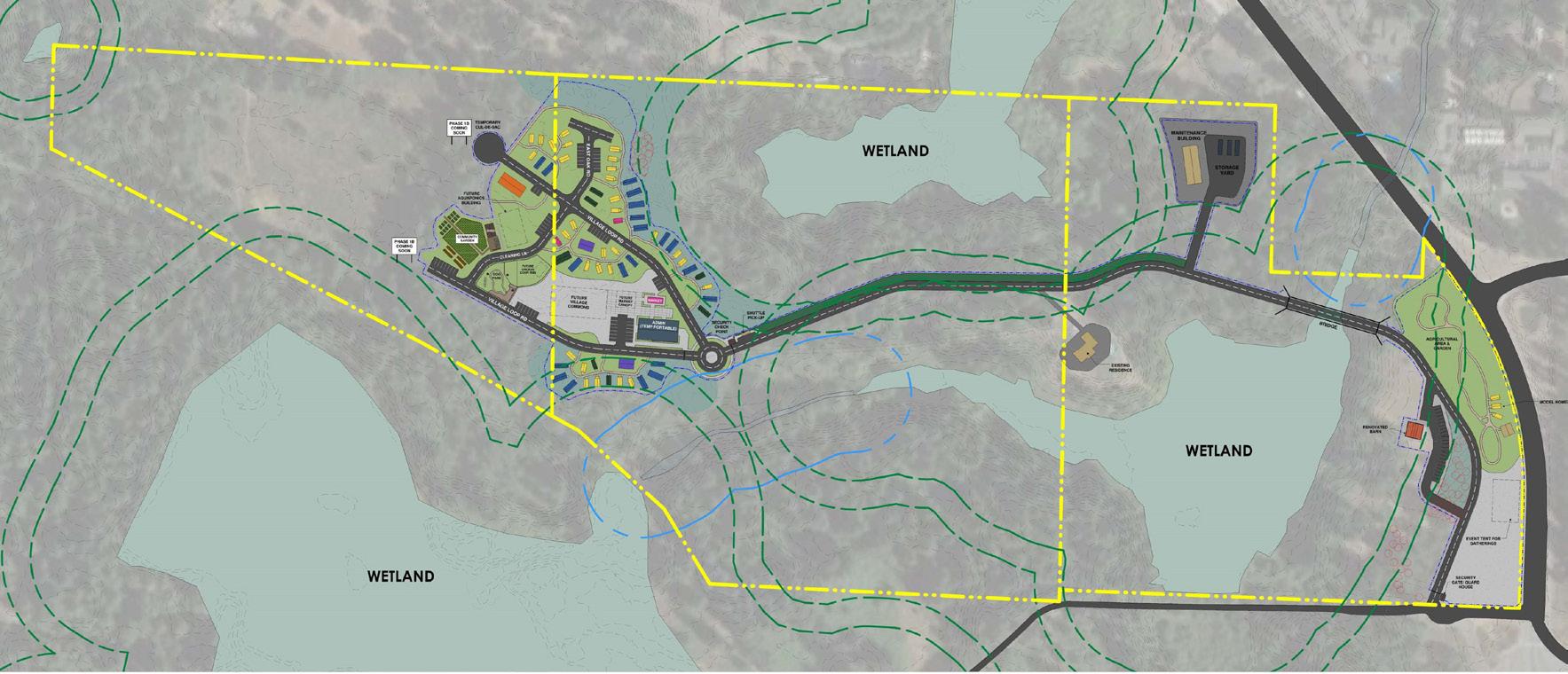The site for the village has approximately 27 buildable acres (of 85.73 acres total). It is located off Spanaway Loop Road with access from 176th Street. Along the northern boundary, there are approximately 15 residences and several wetlands; along the eastern boundary there is a vacant lot and Spanaway Loop Road; and along the southern and western boundaries is Joint Base Lewis-McChord. The site will accommodate 285 microhomes, support buildings, community gathering spaces, microenterprises, and necessary healthcare and case management services.
