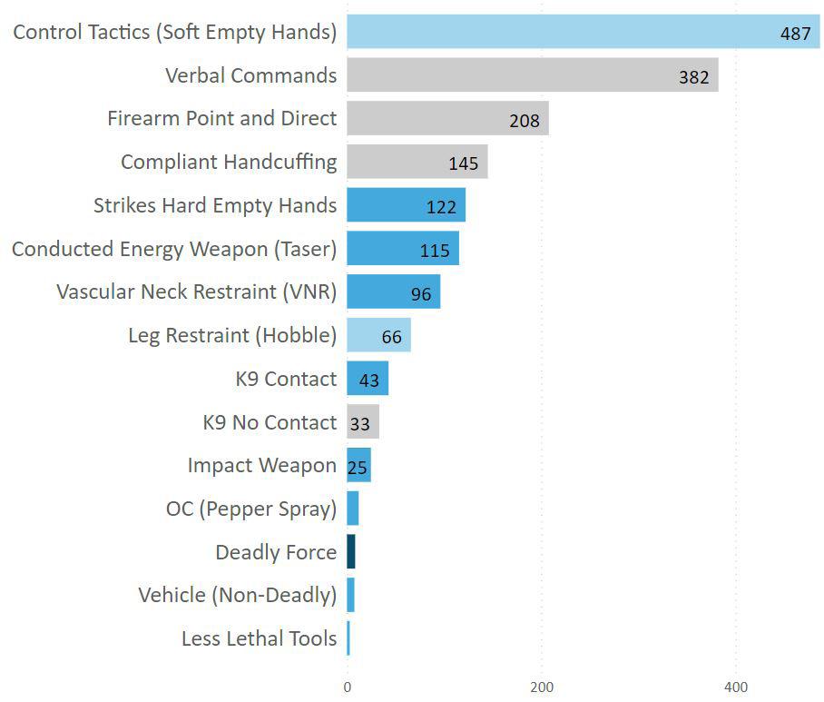 The force dataset in this report contains all force reports by PCSD deputies from 2016-2020. 2016 is the first complete year of data from the current reporting software, and 2020 was the last complete year at the time of the analysis. Uses of force can be counted in terms of incidents or applications.