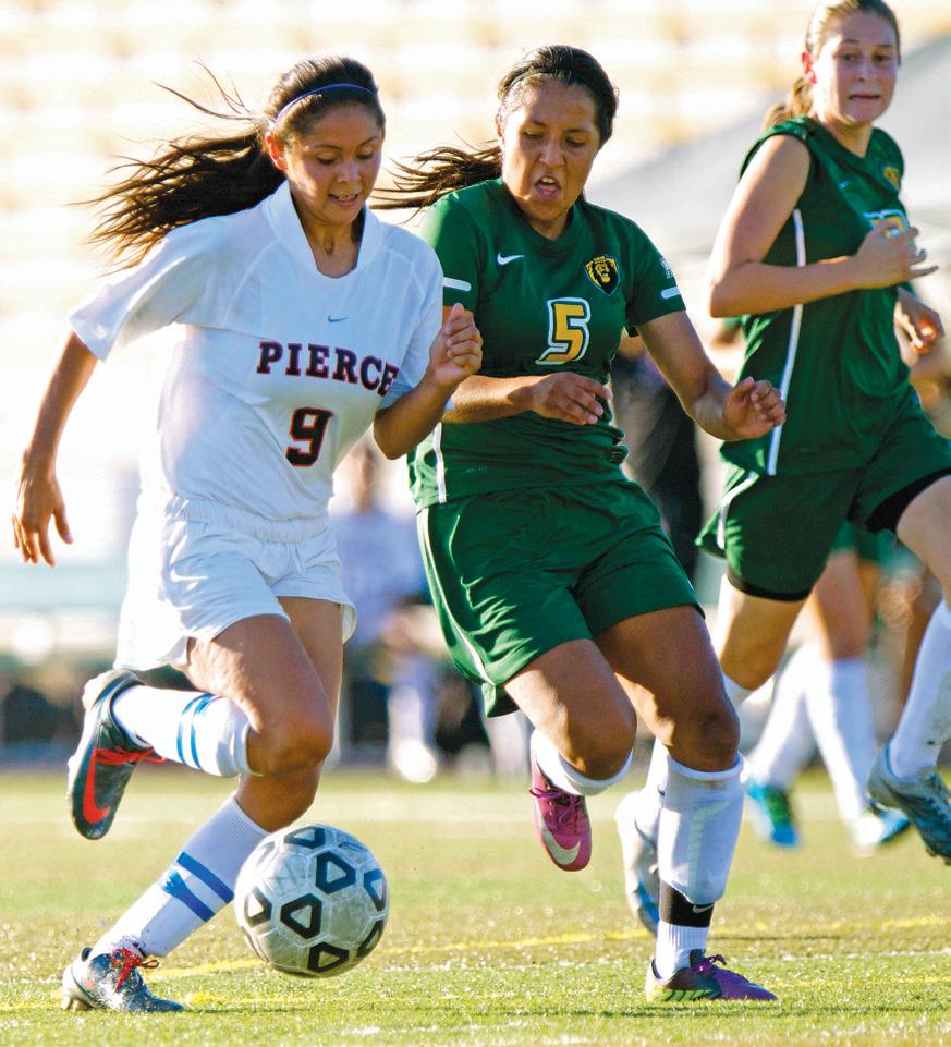 Dribble: Arely Blanco dribbles the ball past Valley College defenders.