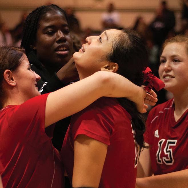 CHAMPS: Brooke Dawson (23) and Ashlea Smith celebrate a point during their state championship victory over Golden West College on Dec. 2. The Brahmas captured their third consecutive state championship, extending their undefeated match streak to 66 games dating back to the 2010 season. All graduating sophomores on the team leave Pierce having never lost a match in their Brahma careers.
