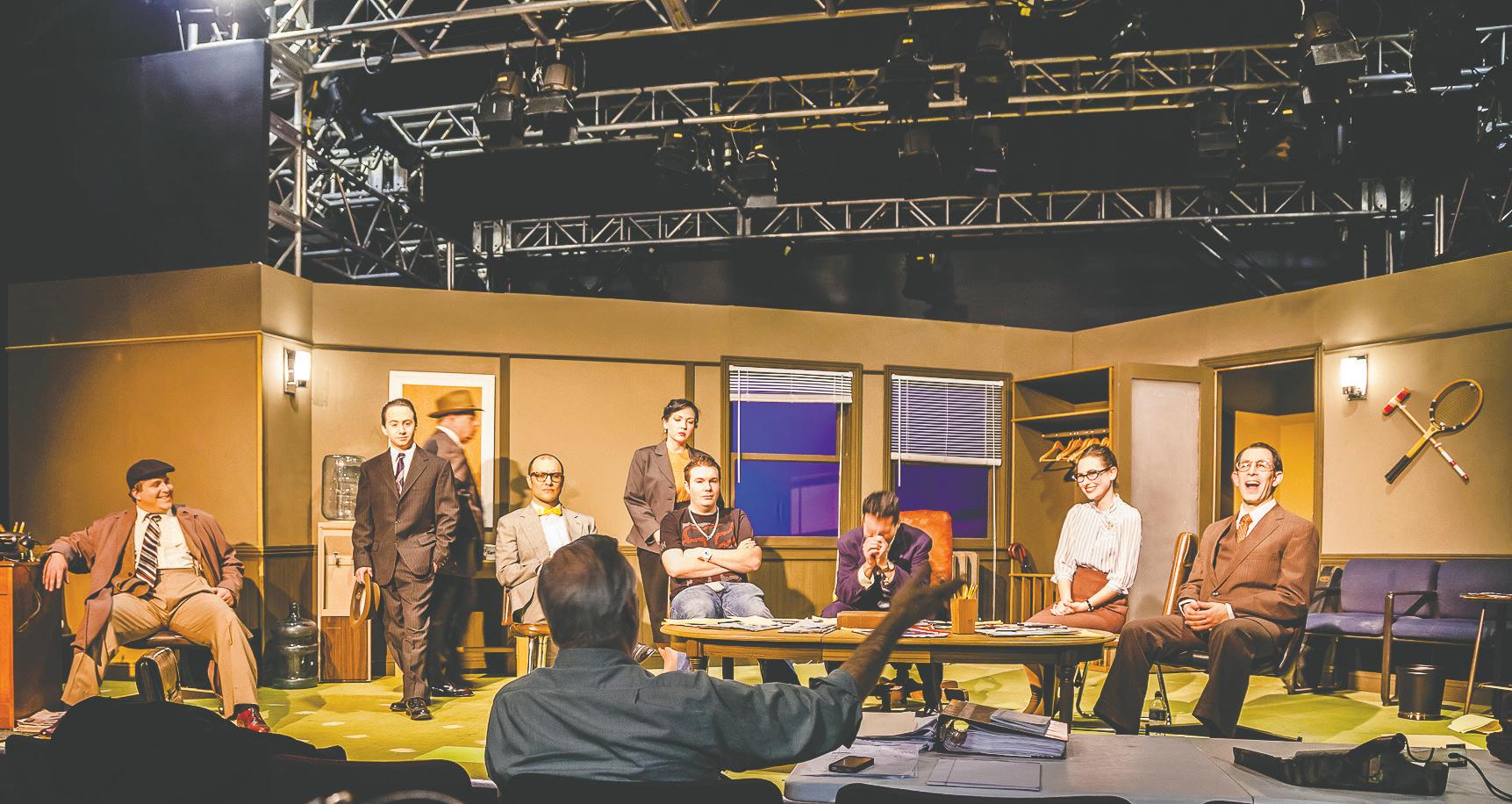 John Gutierrez / Roundup Director Gene Putnam of “Laughter on the 23rd Floor,” written by Neil Simon, talks with cast members on stage before the start of the dress rehearsal on March 18 in the Performing Arts complex at Pierce College. The play premiers March 22.