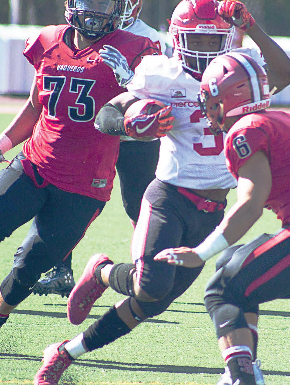 Pierce Football ended their season with an overall record of 5-5. The collective effort helped the Brahmas finish strong with two consecutive wins against league contenders Santa Barbara City College and Antelope Valley College. Brahmas closed their record with three wins and two loses in the 2017 American Pacific Conference.