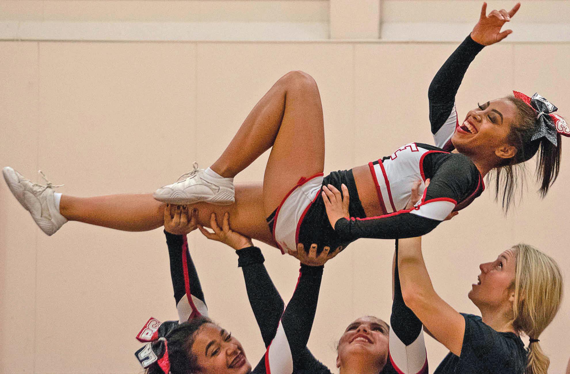 Lailah Vestal is lifted during cheer practice in the North Gym at Pierce College in Woodland Hills, Calif. on April 22, 2019. The Pierce College Cheer