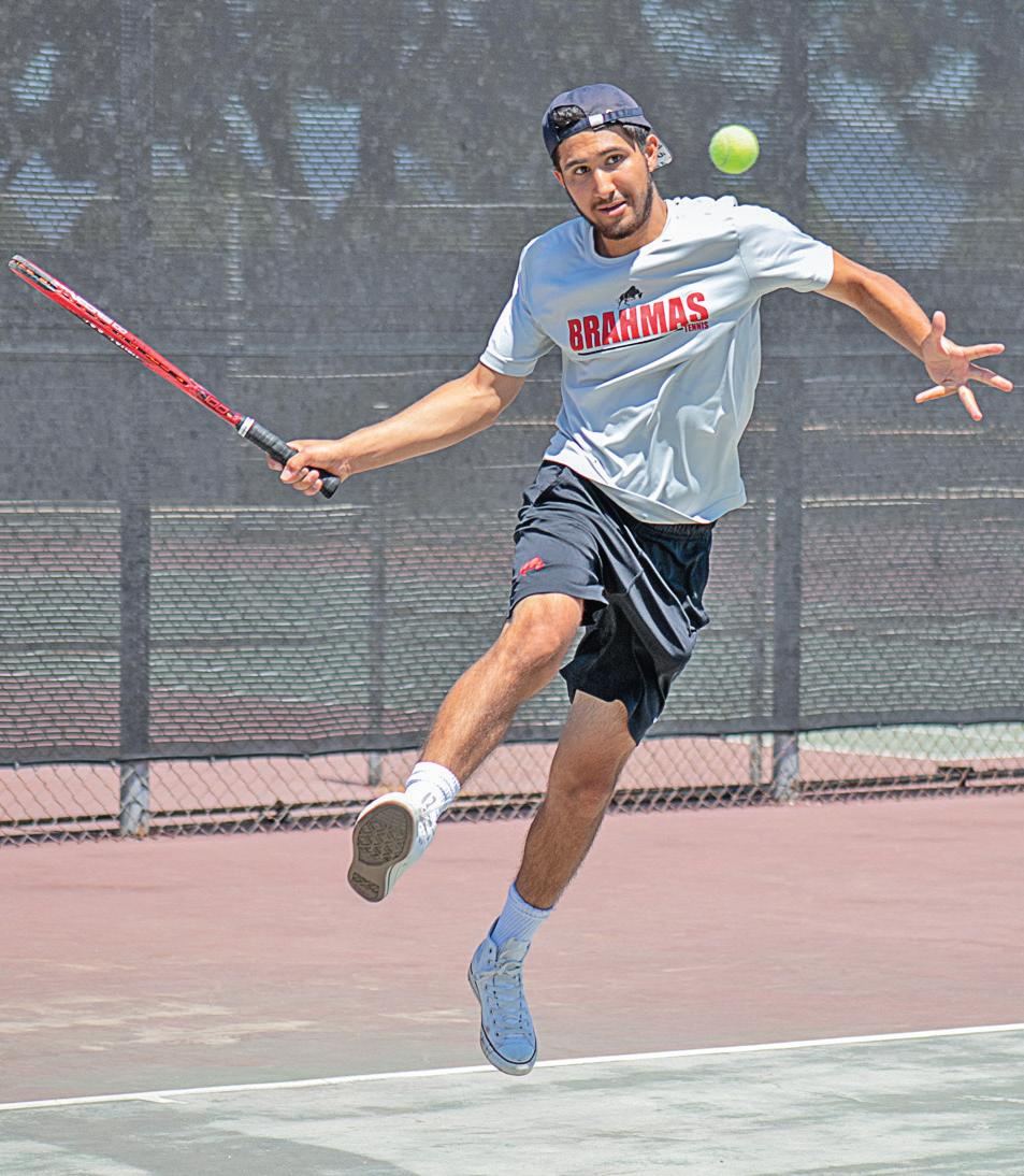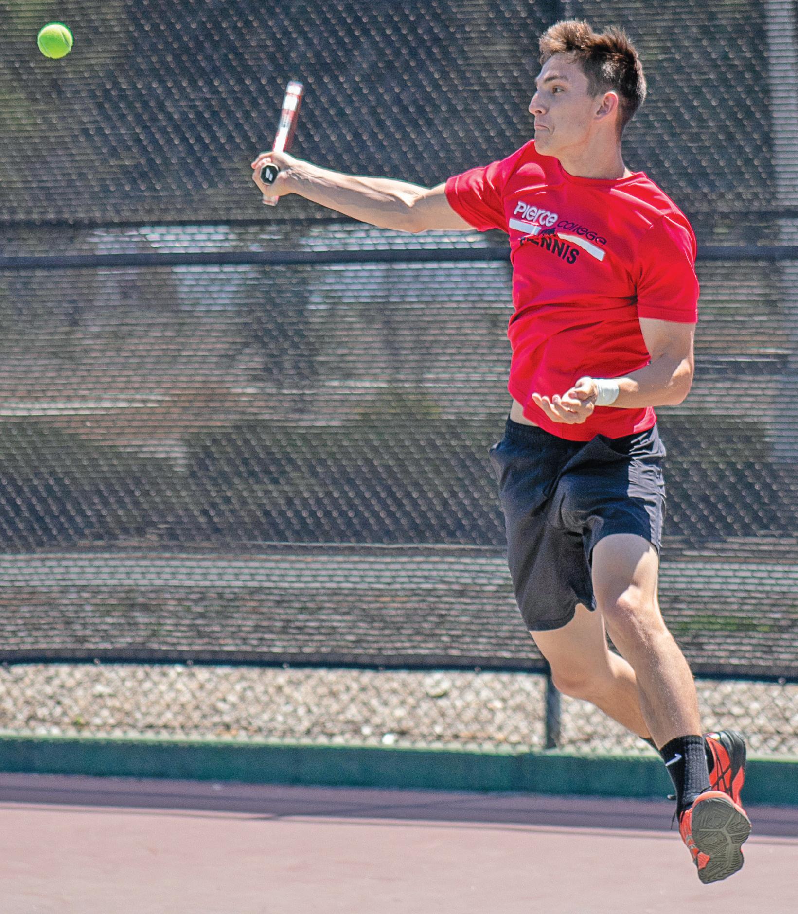 Christopher Torres / Roundup singles two, jumps to hit the ball with a power forehand shot in the Xanthos Tennis Courts at Pierce College in Woodland Hills, Calif., on