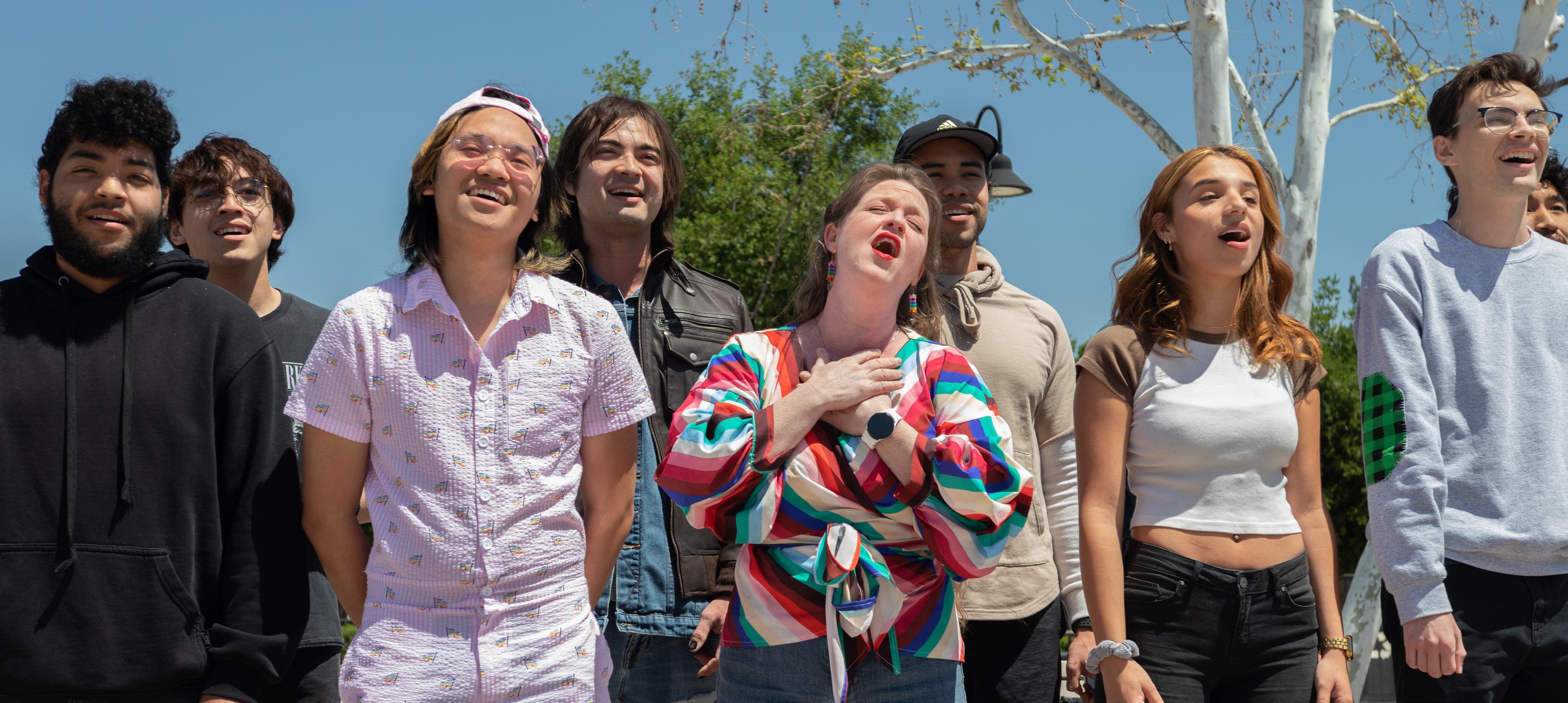 Jenny Moses and student performers sing a song from the upcoming play "Rent" during a flash mob in middle of Mall at Pierce College Woodland Hills Calif., on April 19, 2023.