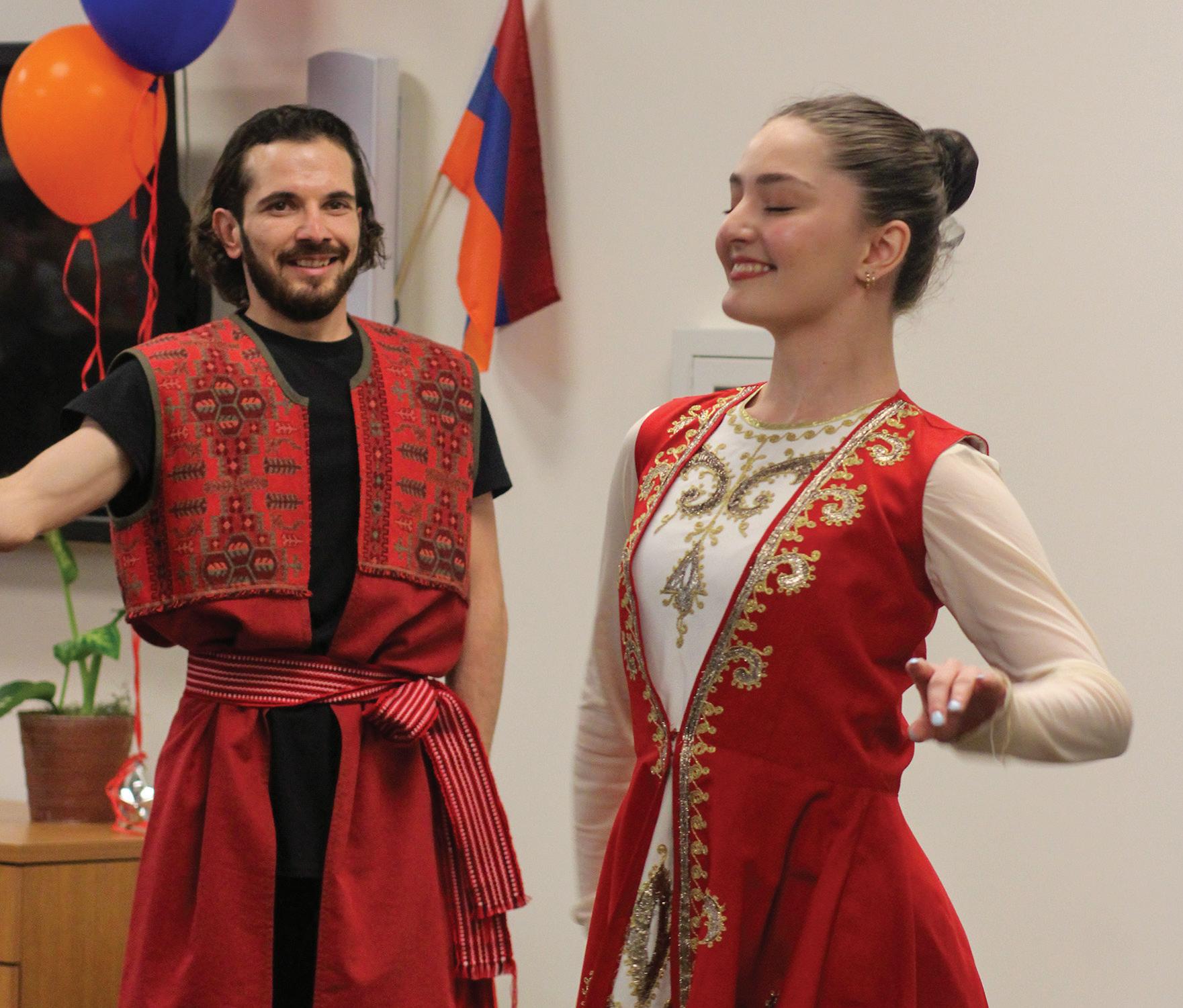 Right: Dancers from the Armenian Berd Ensemble Studio Tina Hovhannisyan and Gagik Tadevosyan perform at the Multicultural Center at Pierce College in Woodland Hills, Calif., on April 25, 2023.