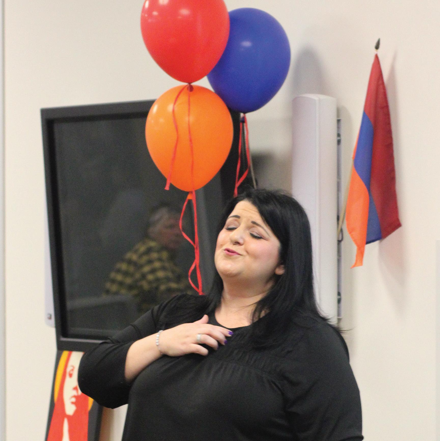Left: Music professor Garineh Avakian sings at the commemoration of the Armenian genocide hosted at the Multicultural Center at Pierce College in Woodland Hills, Calif., on April 25, 2023.
