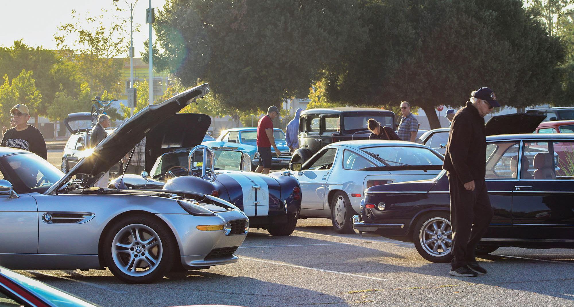 RIGHT: Car enthusiasts gather around to look at the Classic European Cars during Supercar Sunday at Pierce College in Woodland Hills, Calif., on Oct. 7, 2025. Photo by Damian Celedon.