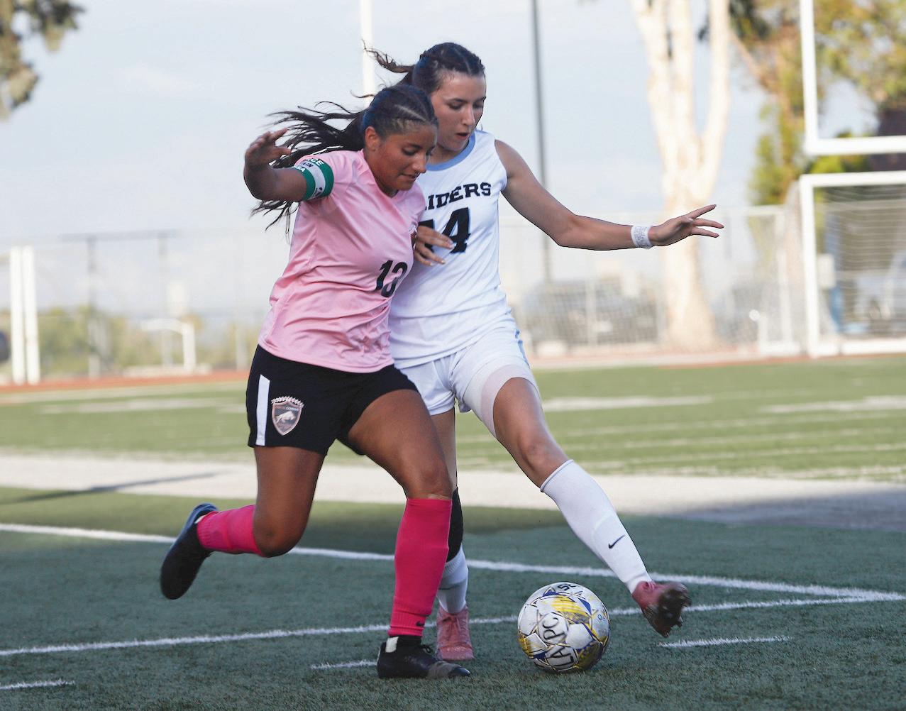 Pierce College midfielder Melissa Nevarez (#13) battles for the ball against Moorpark defender Leilani Arroyo (#14) during a game in Sheperd Stadium at Pierce College in Woodland Hills, Calif., on Oct. 3, 2025.