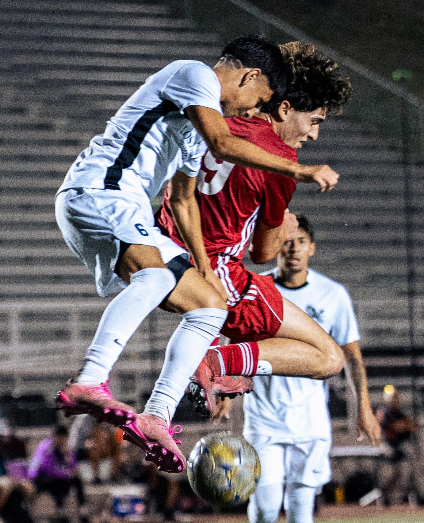 Pierce College forward Alan Gonzalez (#9) jumps up and battles for the ball midair against Los Angeles Mission College midfield Evan Reyes (#8) during a game in Sheperd Stadium at Pierce College in Woodland
