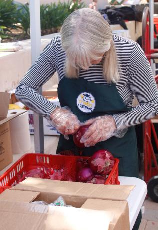 TOP: Volunteer, Helen Secia, peels onions during the Fresh Bodega on The Mall at Pierce College in Woodland Hills, Calif., on Oct. 8, 2025. Photo by Calvin Henry. Sacia is currently taking a quilting class on campus.
