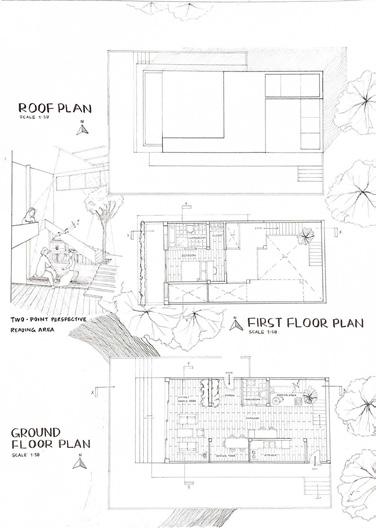 The spaces are protected under a filleted-shaped roof, and a void is created to harness rainwater.