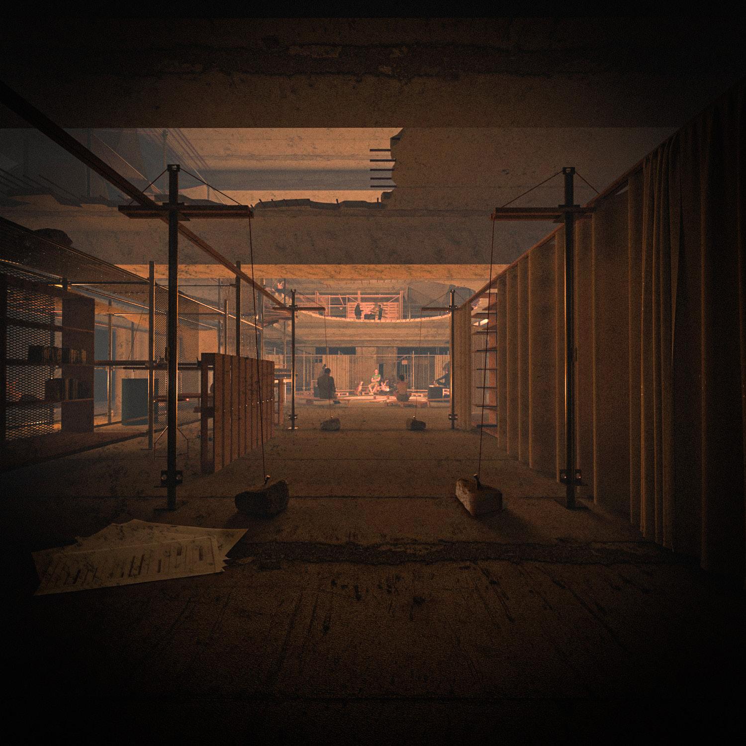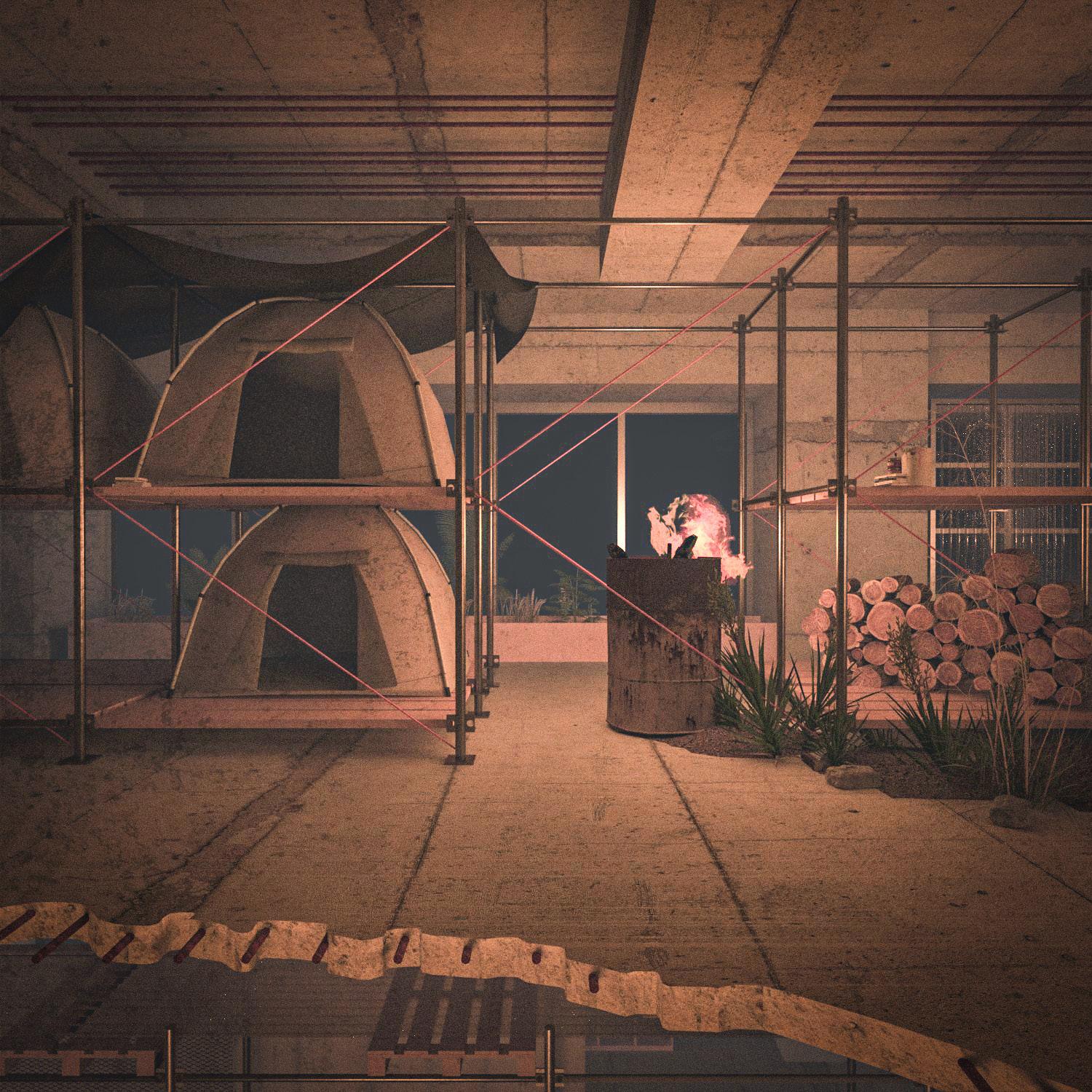 During summer months, the gates are kept open to facilitate ventilation, and the mesh net is deployed. All internal curtains are opened to maximize air circulation throughout the space. In contrast, during winter, the gates are closed, and the mesh net is lifted, allowing only sunlight to penetrate and warm the thermal walls and concrete slabs. Internal curtains are closed to retain heat, and individual heating sources, such as fires, are activated within each zone to ensure comfort in the colder months.