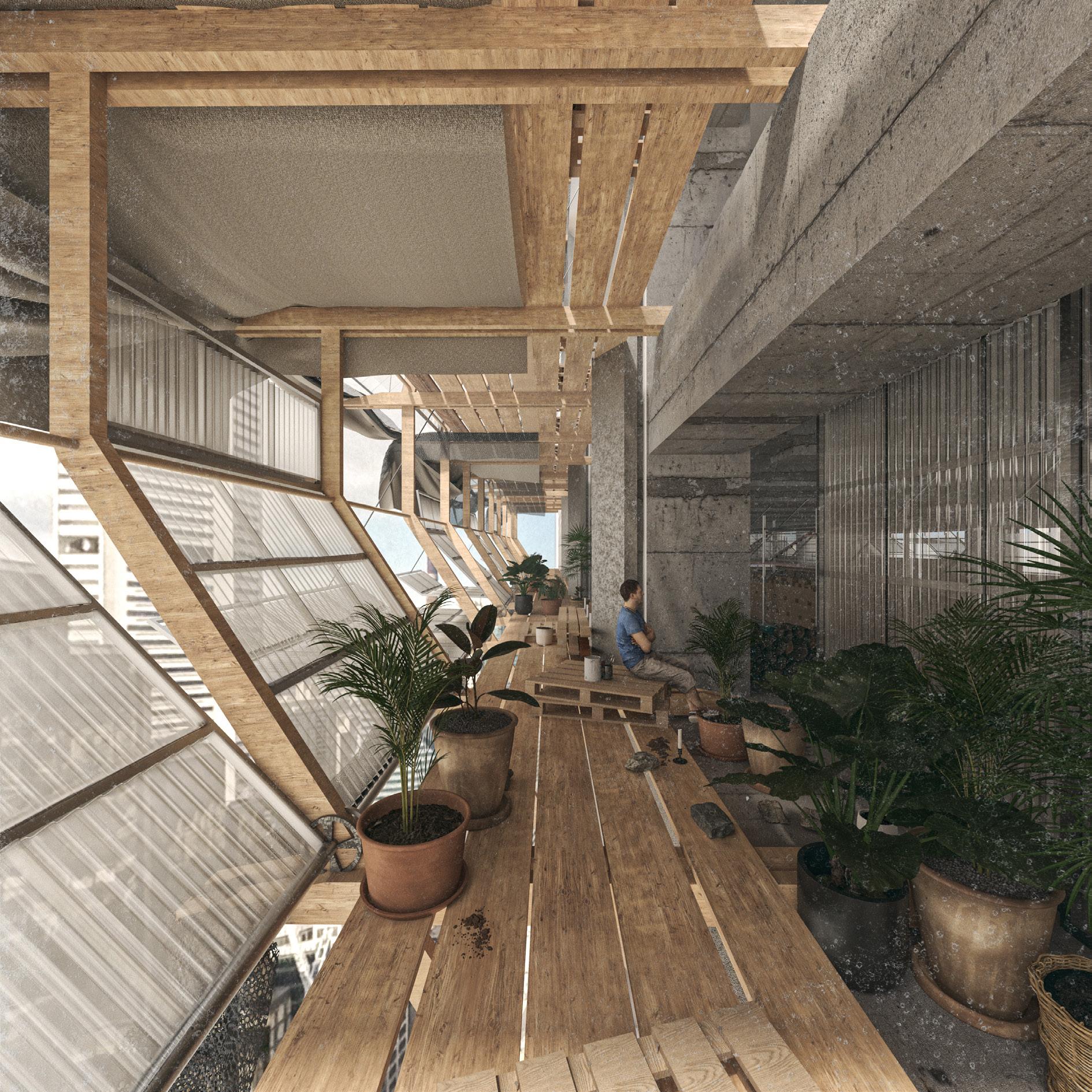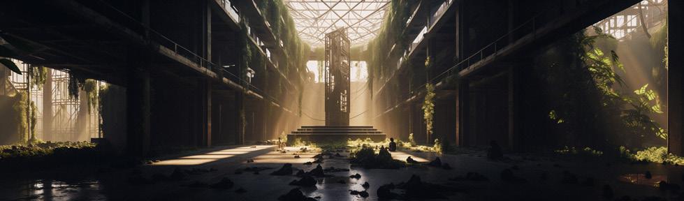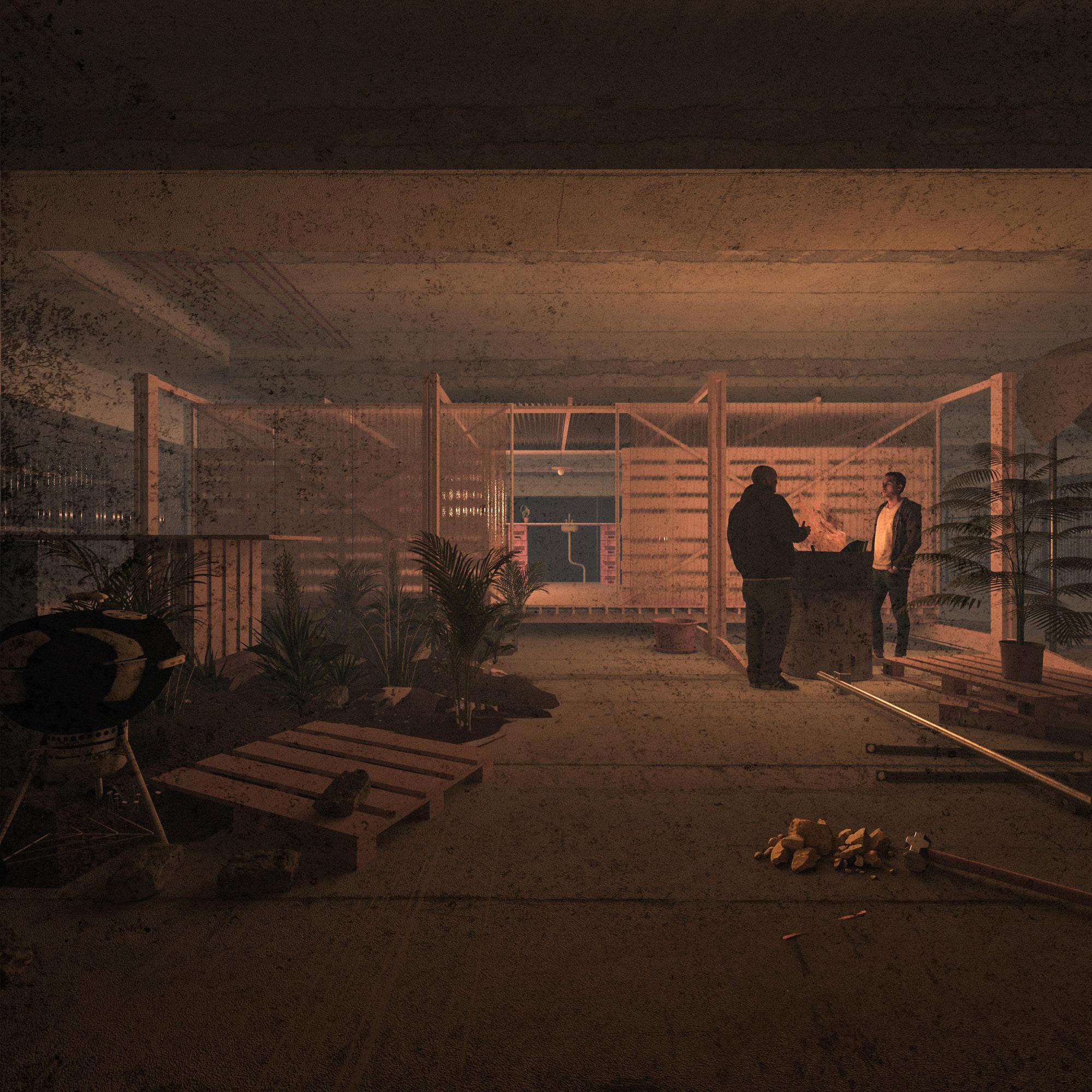 Amidst the decaying remnants of once-thriving skyscrapers, a beacon of hope emerges. Enterprising squatters repurpose floors within these abandoned structures, transforming them into spaces of communal learning, collaboration, and architectural experimentation. Their collective ambition is to rediscover the essence of architecture – the provision of shelter – through the lens of fundamental low-tech techniques. The once gleaming facades of high-tech dominance now echo with the sounds of hands-on construction and shared knowledge. In this inspiring movement, the aim is clear: to craft an architecture that resonates with its inherent purpose and finds equilibrium with the natural world. From the detritus of the past, these pioneers reimagine a future defined by adaptive reuse, forging a new vernacular that echoes the harmony between humanity and its surroundings.”