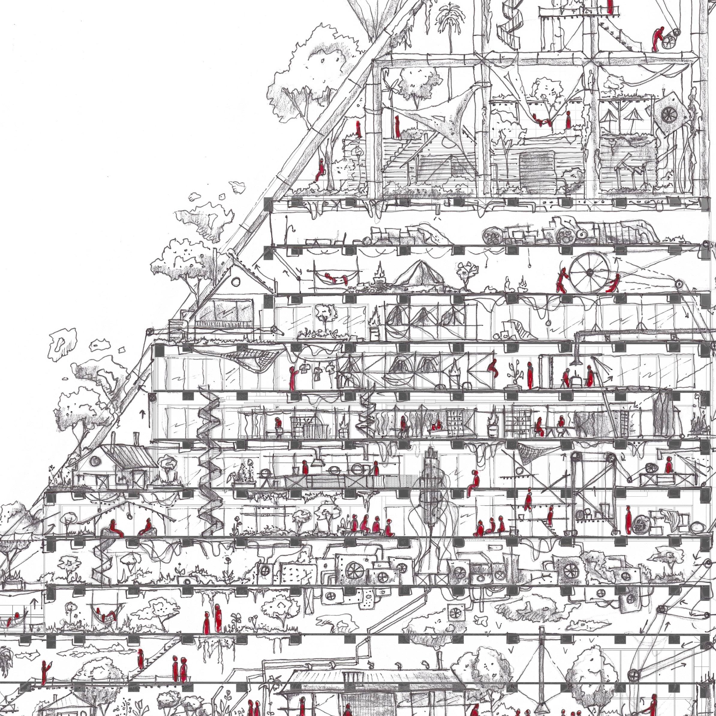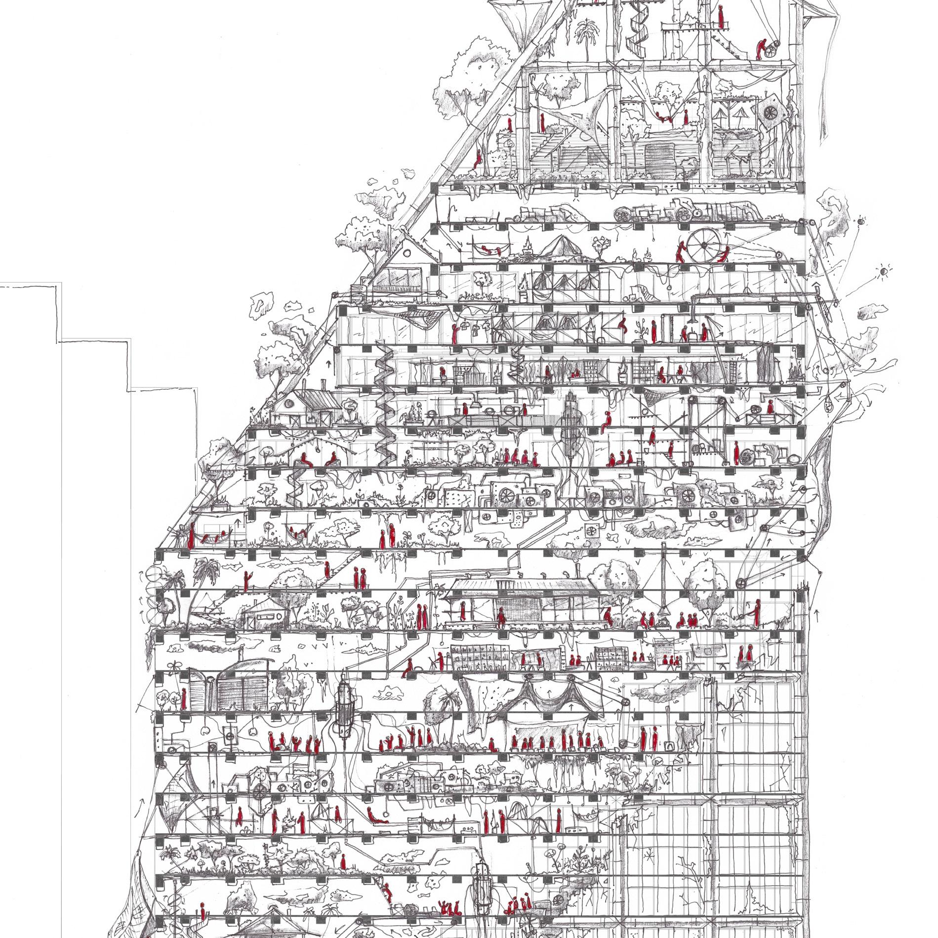 James Wines’ drawings for the Highrise of Homes departs from conventional facades. Instead of emphasizing exterior features, Wines focuses on the structural framework, transforming it into an open landscape for construction. This approach establishes a unique connection with natural elements at every level, blurring the boundaries between the built environment and nature.