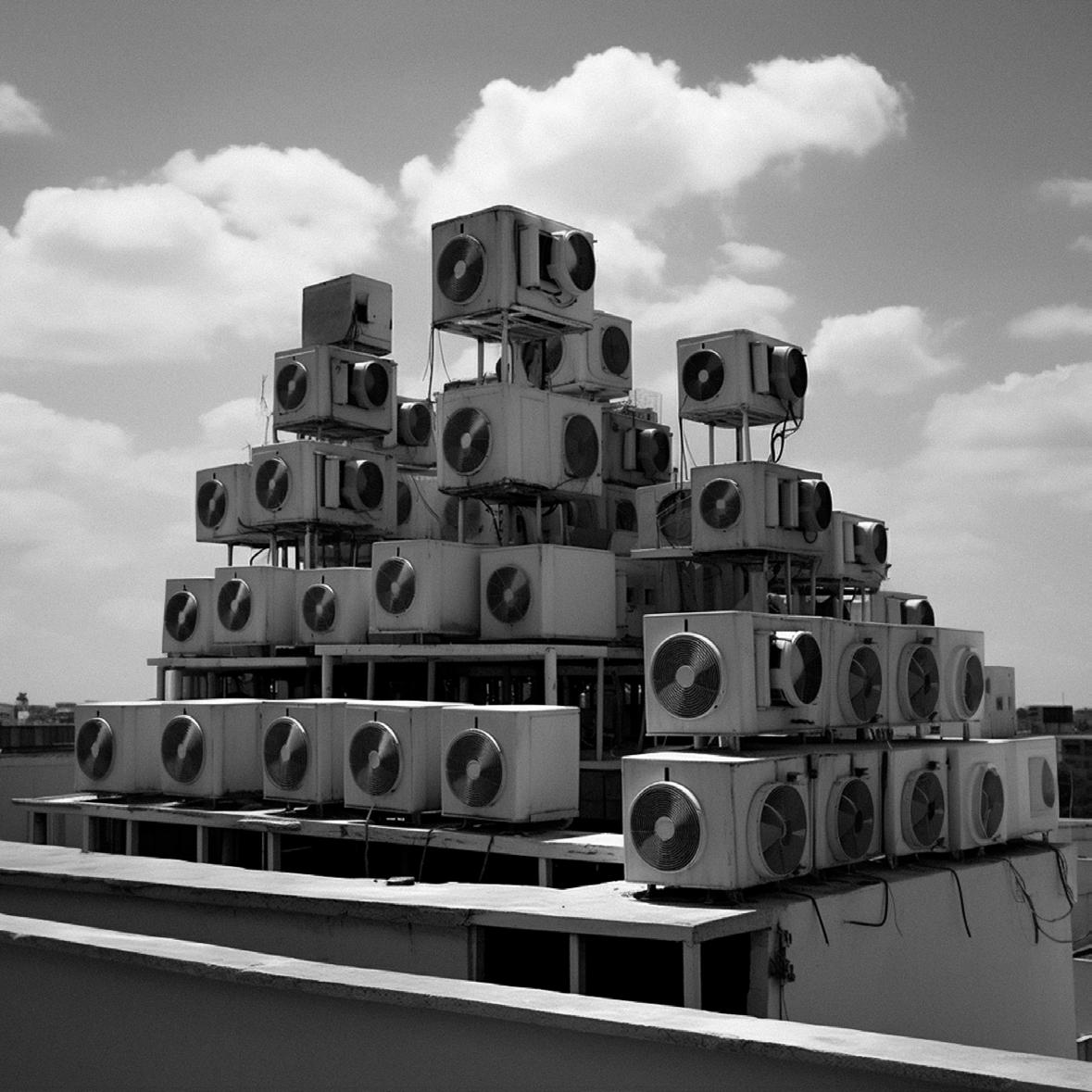 “front facade elevation many air conditioners on the top of a building, in the style of zeiss ikon zm, hurufiyya, post-modern installation artist, nouveau réalisme, majestic ports, brooding mood, grid-based” A.i Generated