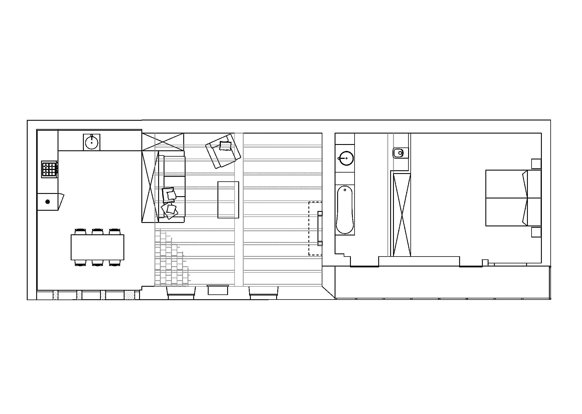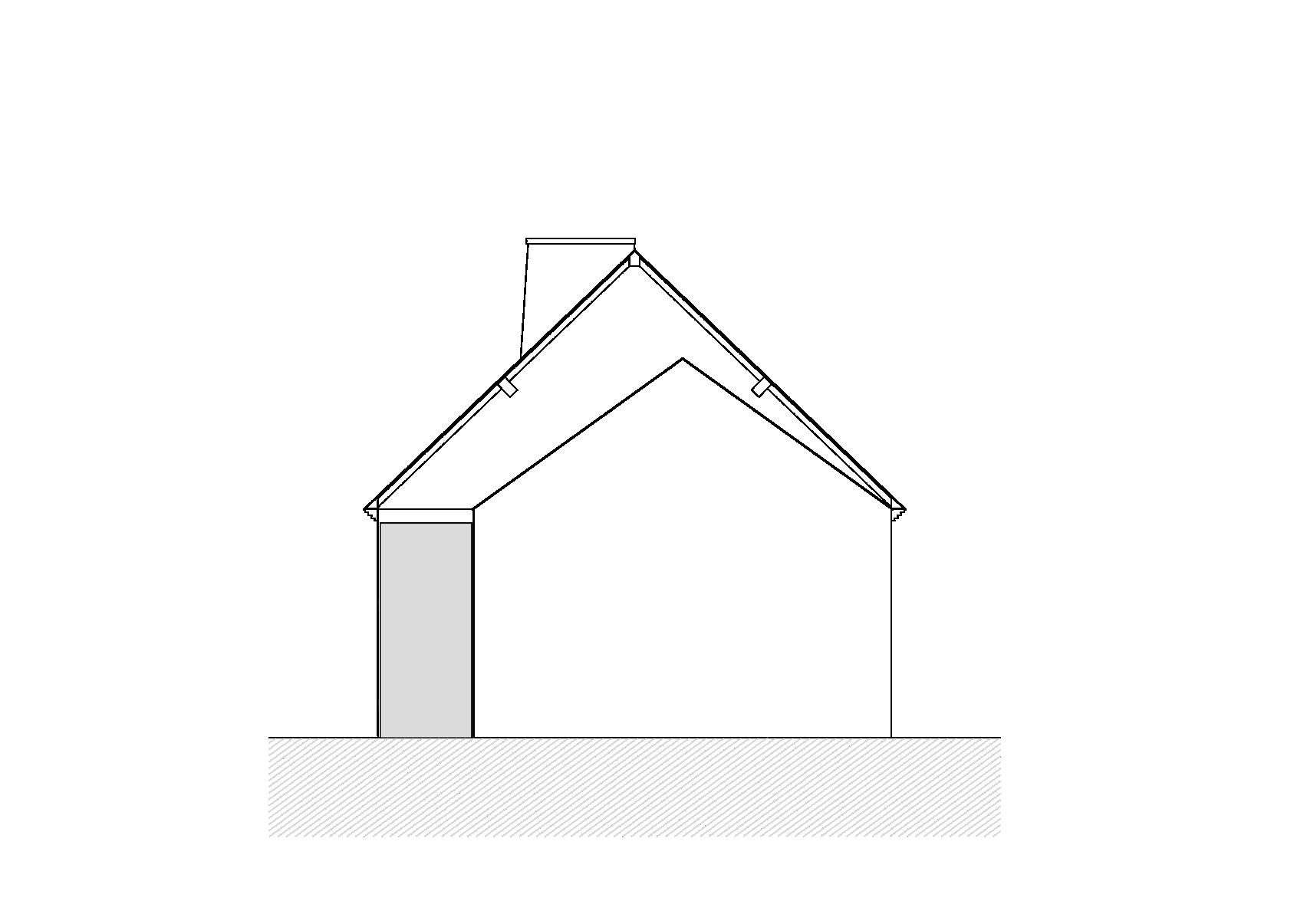 Le projet préserve la partie centrale, qui est la mieux conservée, et vient compléter les deux ailes qui vont accueillir la cuisine, la salle de bain et la chambre pour leur offrir de la lumière naturelle. La partie centrale devient la pièce la plus chaleureuse avec l’enduit et le pavage d’origine.