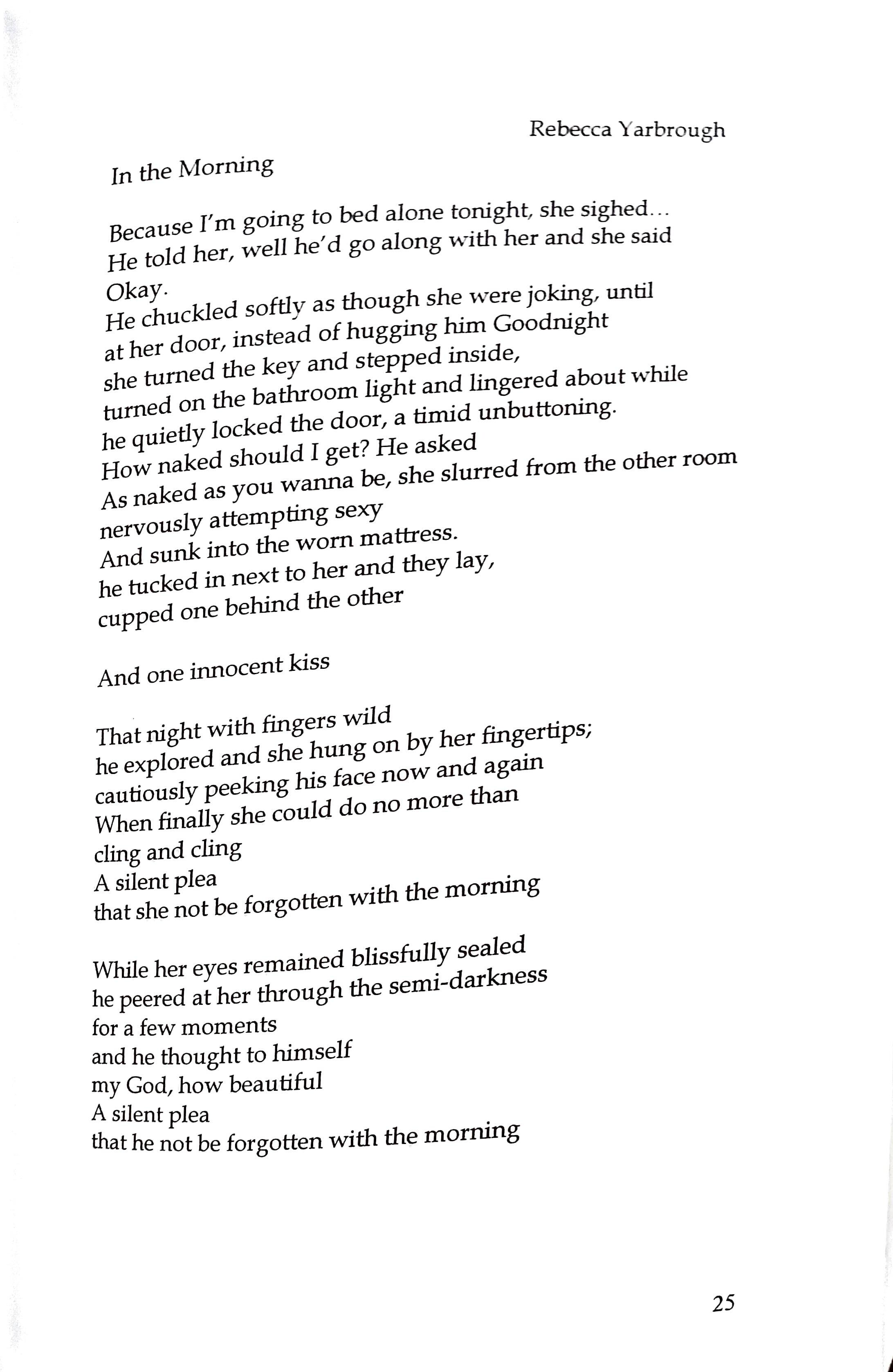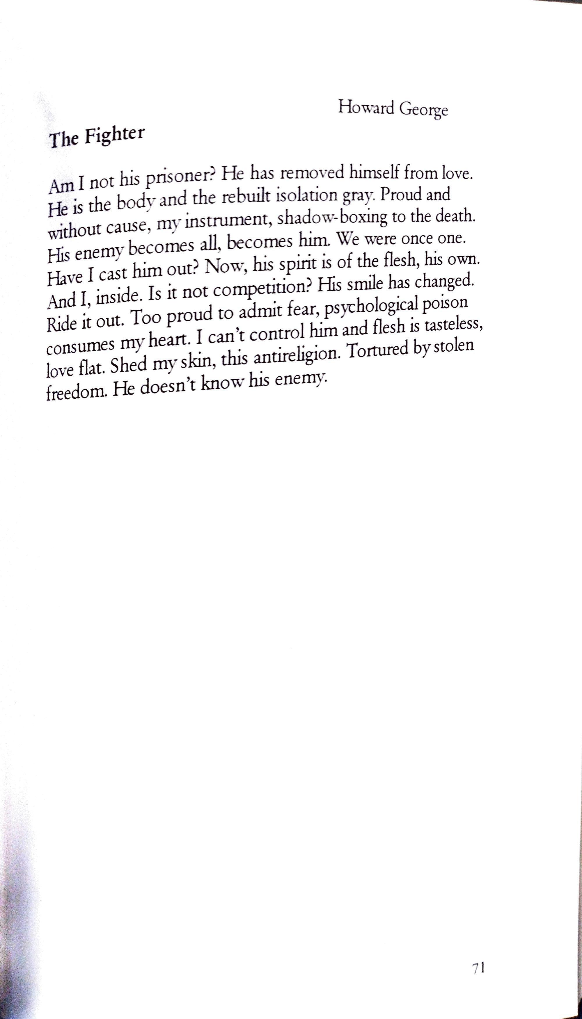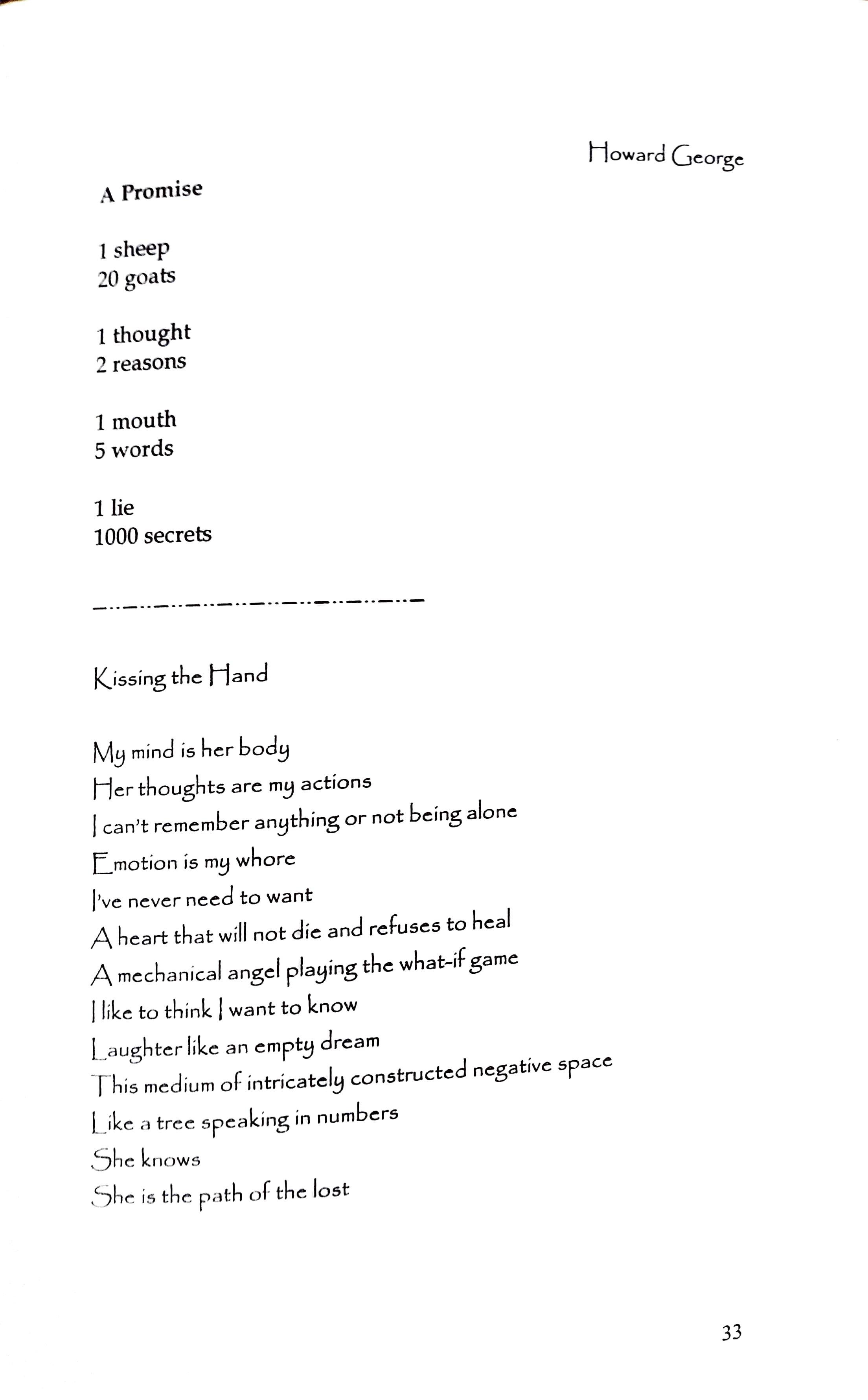 Kissing the Hand Howard George Mutiny Susan Smith Spray Pal 2 Peter Pranschke Yellow Nights of Parties Morgan Cameron Men Who Taste Like Alcohol April Bozada-Annstrong Cat Dog's Second Slice Peter Pranschke Rocking Chairs Jamie Kerry The Comer Coffee House Jamie Kerry #5 Howard George "Some poets should write about breakfast cereal rather than hunger" Jamie Lynn Smith Spray Pal 5 Peter Pranschke The Back of Her Head Morgan Cameron Home by Nightfall Julie Gram Accident Jamie Kerry Moo nshine Ray Bloom Rea l Es tate, 1869 . Bo b Bliss M1zuko Ji zo Jeffrey Pechmann 33 34 35 36 38 47 48 49 50 51 52 53 56 57 58 59 60