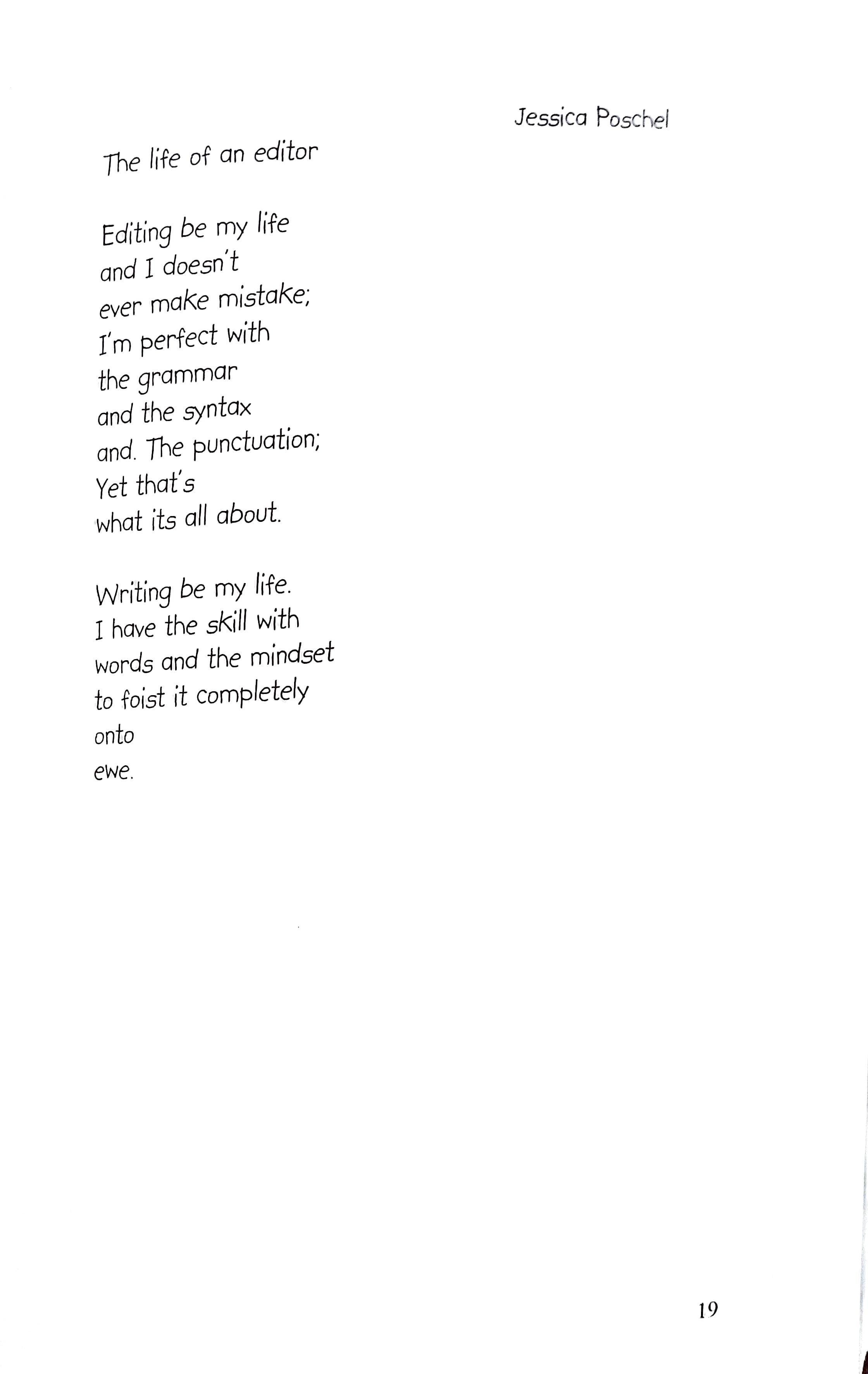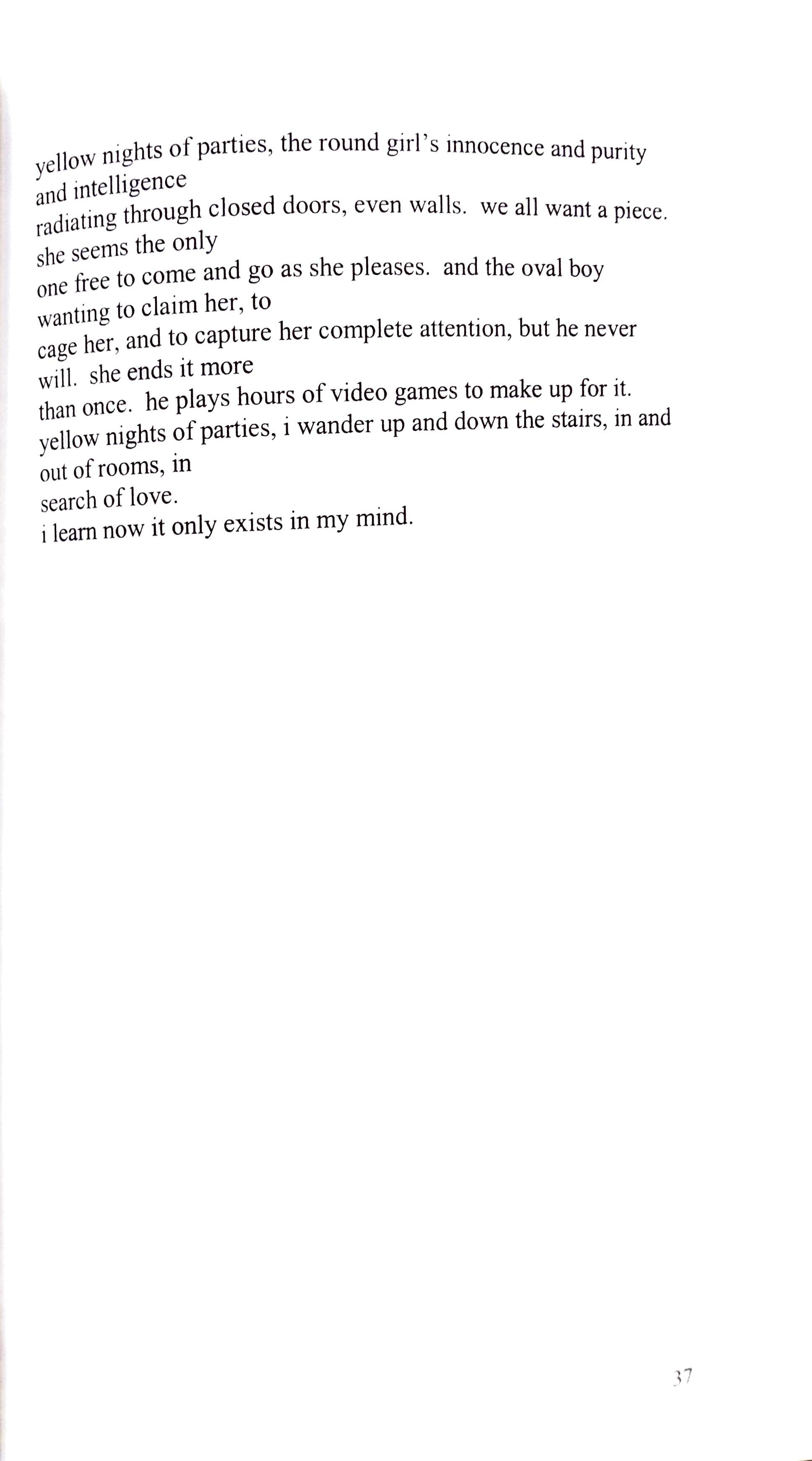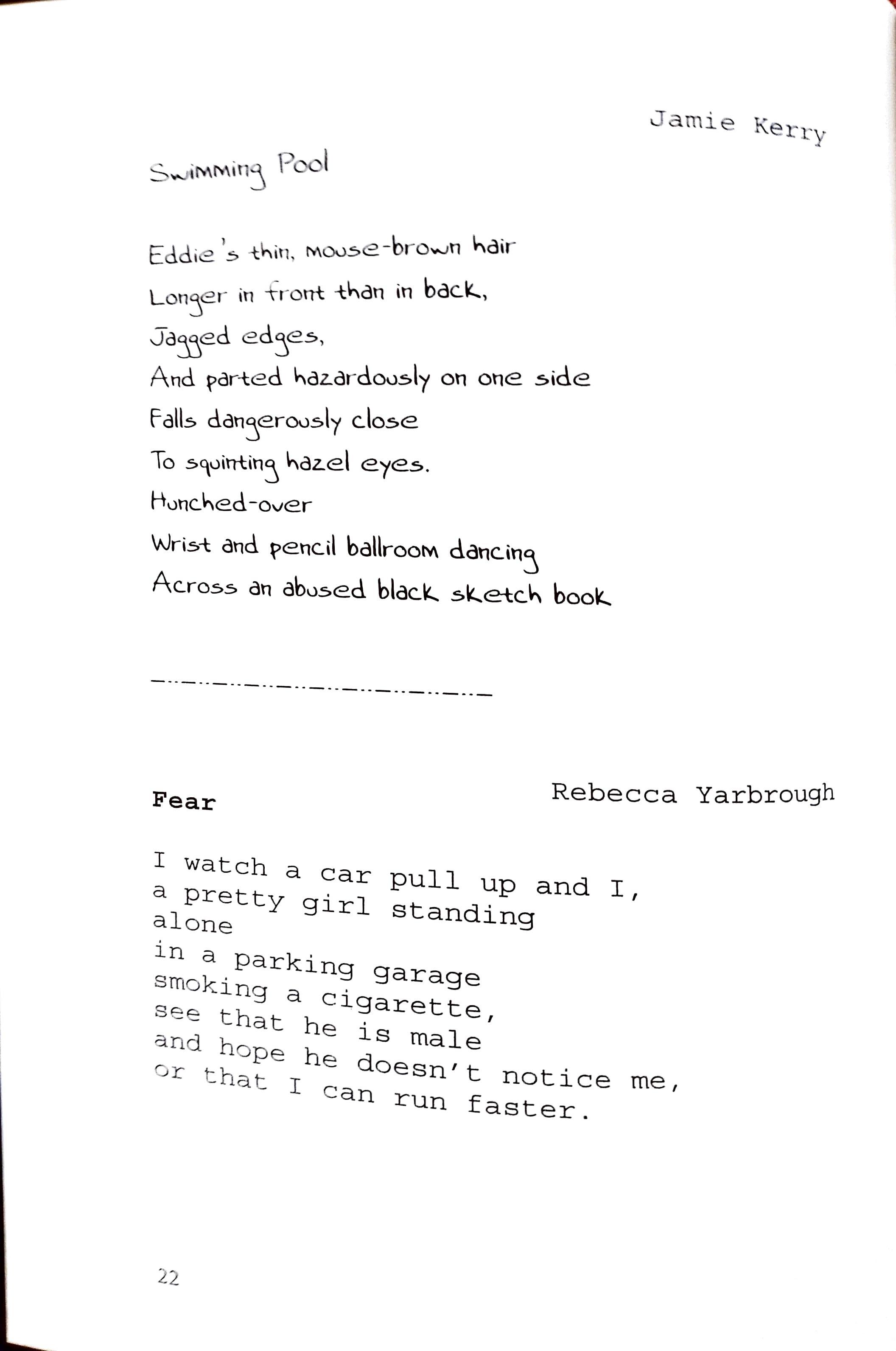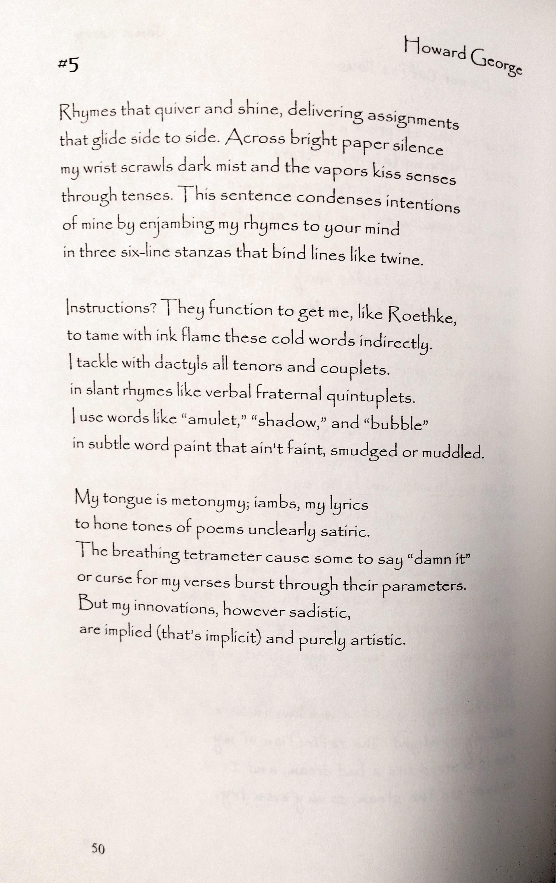 Kissing the Hand Howard George Mutiny Susan Smith Spray Pal 2 Peter Pranschke Yellow Nights of Parties Morgan Cameron Men Who Taste Like Alcohol April Bozada-Annstrong Cat Dog's Second Slice Peter Pranschke Rocking Chairs Jamie Kerry The Comer Coffee House Jamie Kerry #5 Howard George "Some poets should write about breakfast cereal rather than hunger" Jamie Lynn Smith Spray Pal 5 Peter Pranschke The Back of Her Head Morgan Cameron Home by Nightfall Julie Gram Accident Jamie Kerry Moo nshine Ray Bloom Rea l Es tate, 1869 . Bo b Bliss M1zuko Ji zo Jeffrey Pechmann 33 34 35 36 38 47 48 49 50 51 52 53 56 57 58 59 60