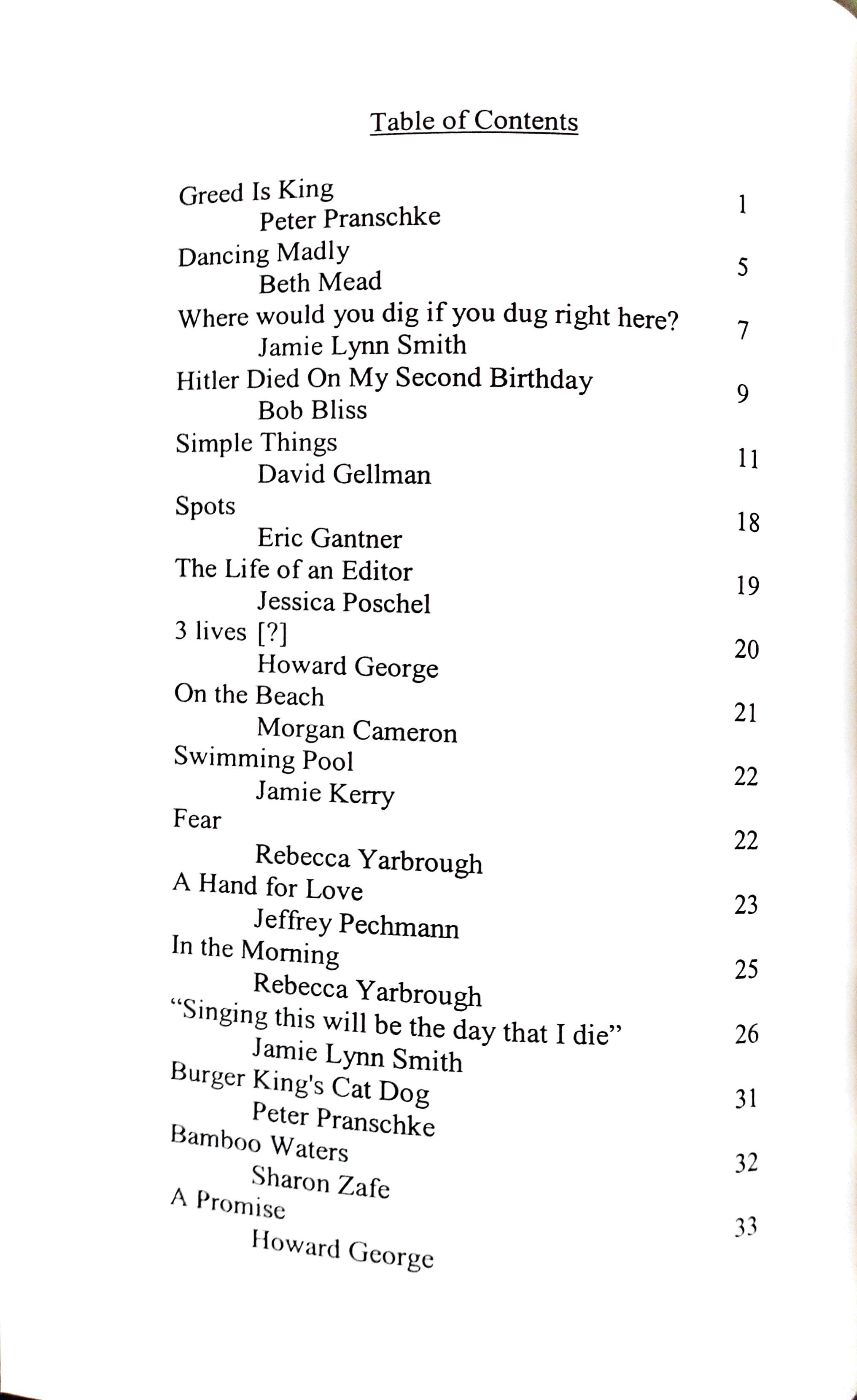 of Contents Greed Is King 1 Peter Pranschke Dancing Madly 5 Beth Mead Where would you dig i~ you dug right here? 7 Jamie Lynn Smith Hitler Died On My Second Birthday 9 Bob Bliss Simple Things 11 David Gellman Spots 18 Eric Gantner The Life of an Editor 19 Jessica Paschel 3 lives [?] 20 Howard George On the Beach 21 Morgan Cameron Swimming Pool 22 Jamie Kerry Fear 22 Rebecca Yarbrough A Hand for Love 23 Jeffrey Pechmann In the Morning 25 " . . Rebecca Yarbrough Singing this will be the day that I die" 26 Jamie Lynn Smith Burger King's Cat Dog 31 Peter Pranschke Bamboo Waters 32 Sharon Zafe A Promi se ., 3~ ) Howard George L